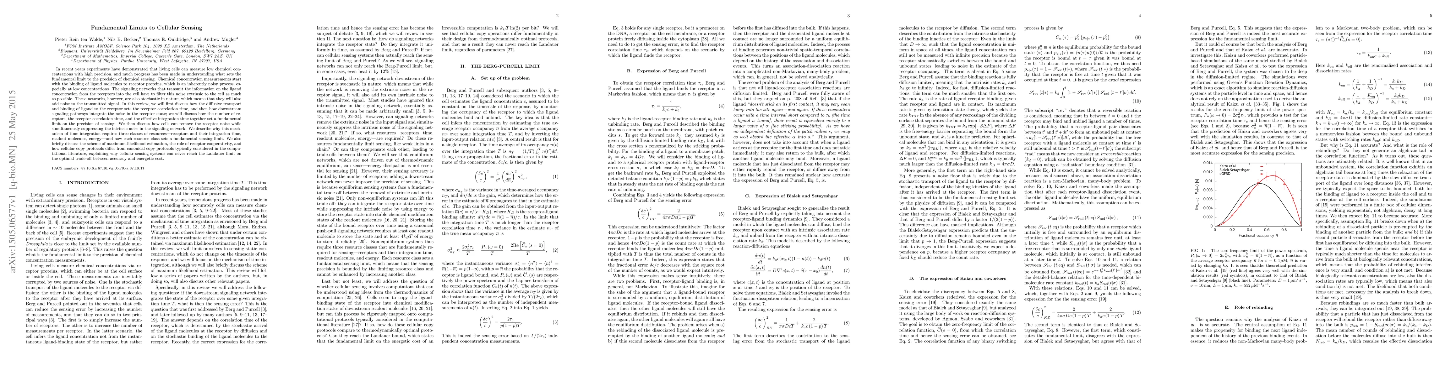 This paper reviews the fundamental limits on cellular chemical sensing, focusing on the precision of ligand concentration measurements. It discusses how noise from ligand binding to receptors and stochastic signaling networks constrains sensing precision, and explores the role of receptor correlation time, integration time, and resource allocation in setting these limits.