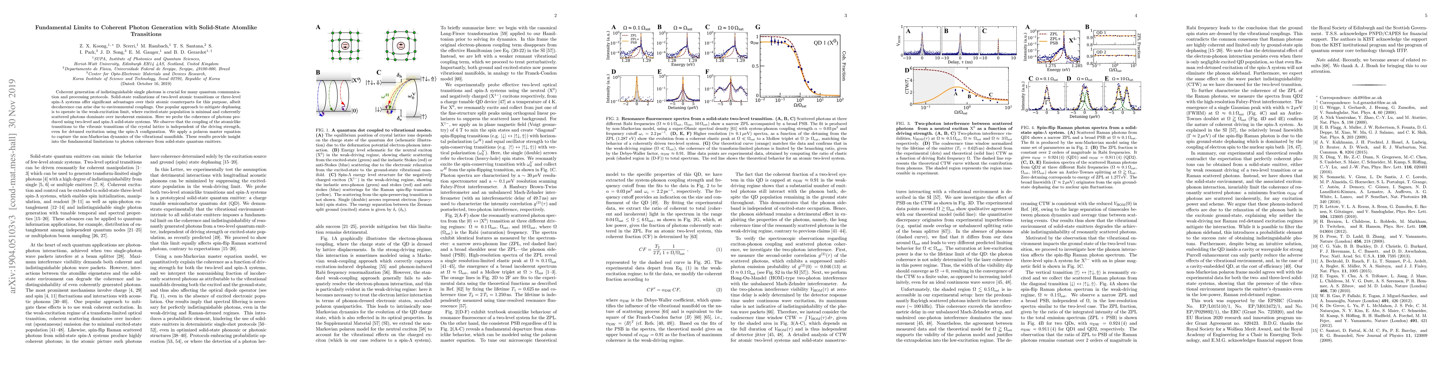 Coherent generation of indistinguishable single photons is crucial for many quantum communication and processing protocols. Solid-state realizations of two-level atomic transitions or three-level spin-$\Lambda$ systems offer significant advantages over their atomic counterparts for this purpose, albeit decoherence can arise due to environmental couplings. One popular approach to mitigate dephasing is to operate in the weak excitation limit, where excited state population is minimal and coherently scattered photons dominate over incoherent emission. Here we probe the coherence of photons produced using two-level and spin-$\Lambda$ solid-state systems. We observe that the coupling of the atomic-like transitions to the vibronic transitions of the crystal lattice is independent of driving strength and detuning. We apply a polaron master equation to capture the non-Markovian dynamics of the ground state vibrational manifolds. These results provide insight into the fundamental limitations for photon coherence from solid-state quantum emitters, with the consequence that deterministic single-shot quantum protocols are impossible and inherently probabilistic approaches must be embraced.