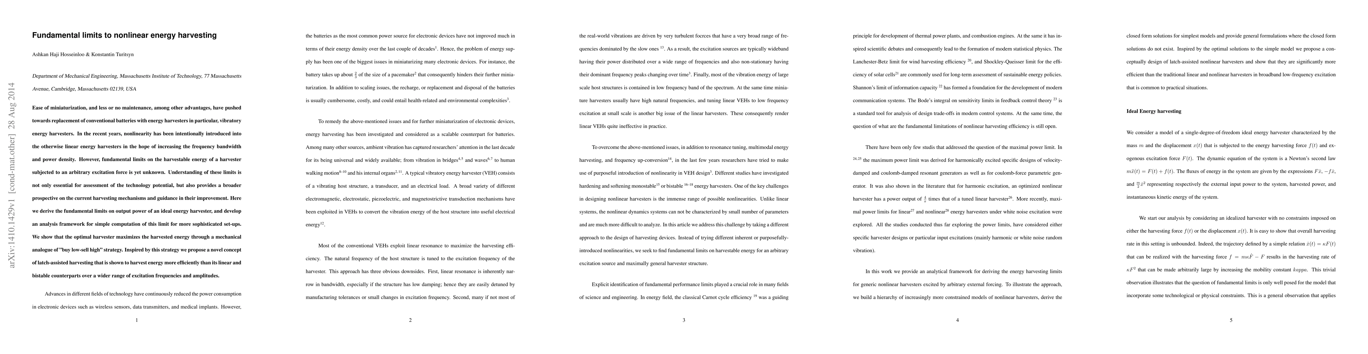 Researchers derived fundamental limits on output power of ideal energy harvesters, revealing an optimal 'buy low-sell high' strategy, and proposed a novel latch-assisted harvesting concept that outperforms existing methods.