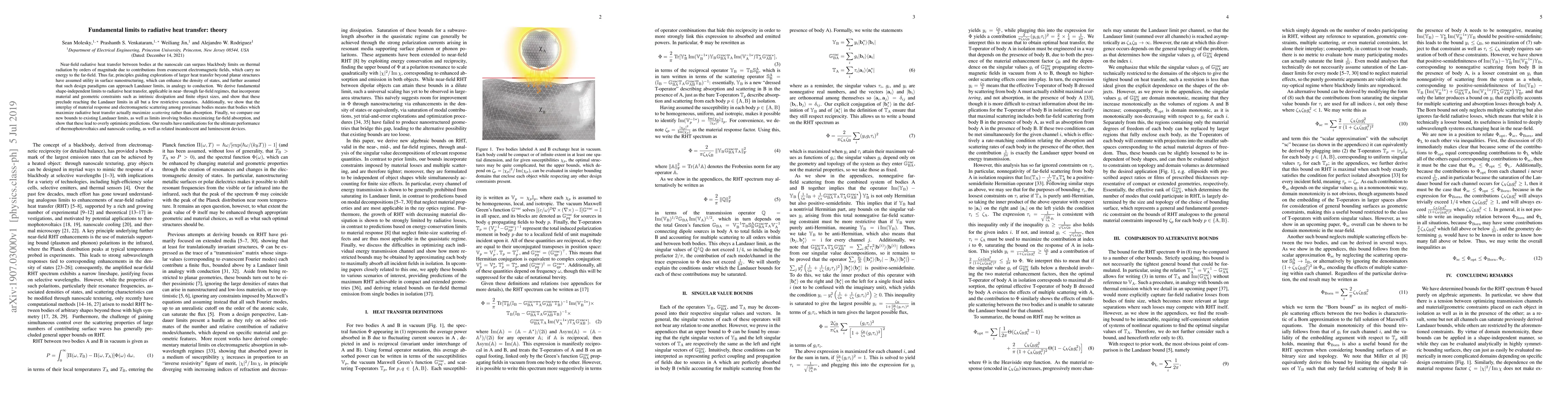 This paper establishes fundamental limits to radiative heat transfer, demonstrating that near-field effects cannot surpass blackbody limits in most scenarios due to material and geometric constraints. It shows that while nanostructuring can enhance heat transfer, it does not approach Landauer limits, and that maximizing radiative heat transfer often correlates with increased scattering rather than absorption.