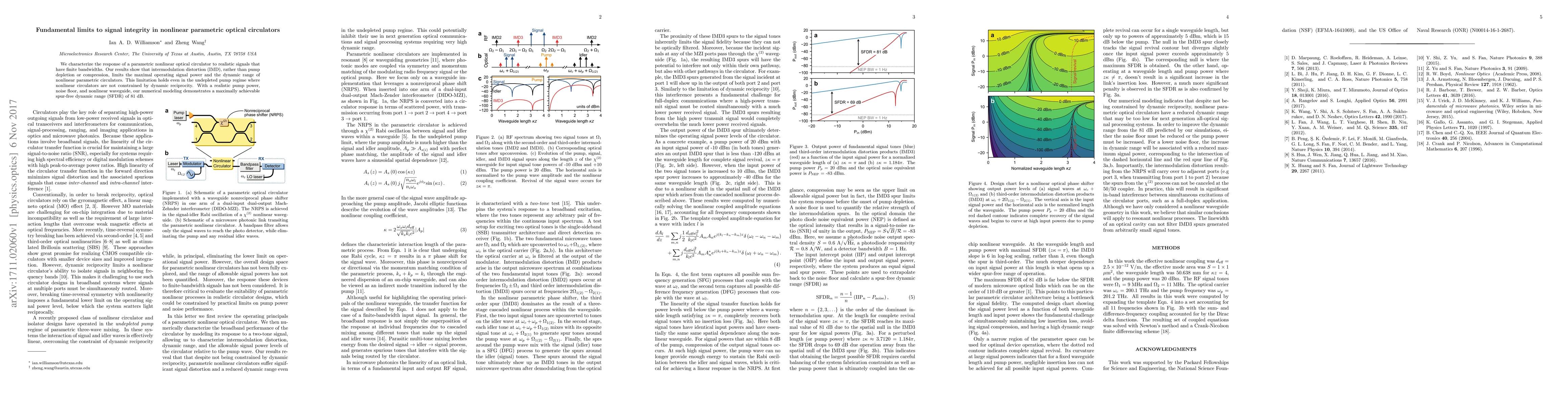 This paper investigates the fundamental limits to signal integrity in nonlinear parametric optical circulators, finding that intermodulation distortion (IMD) constrains maximal operating signal power and dynamic range, even in the undepleted pump regime. Numerical modeling reveals a maximum achievable spur-free dynamic range (SFDR) of 81 dB.