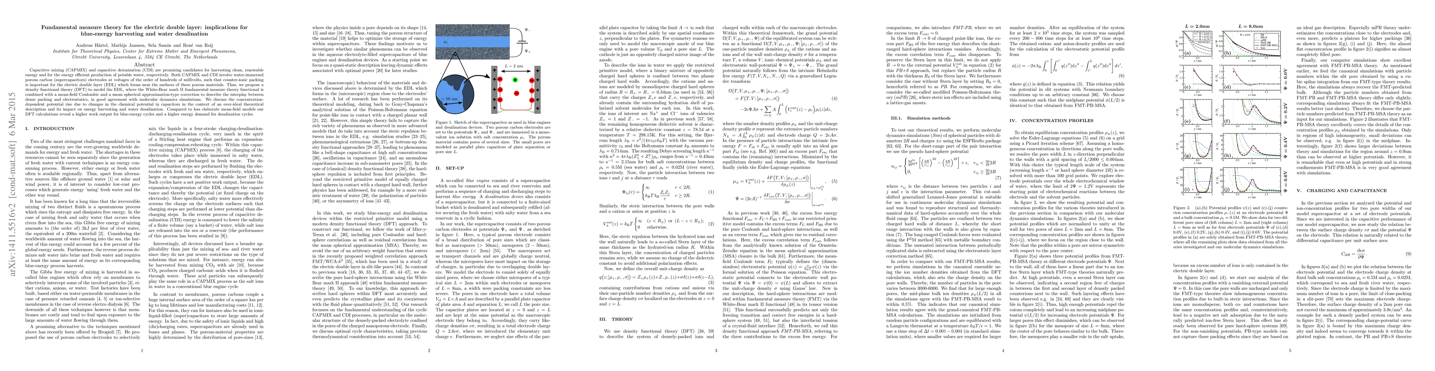 This paper proposes a density functional theory model using fundamental measure theory to describe the electric double layer in capacitive mixing and deionization processes, revealing higher work output for energy harvesting and higher energy demand for desalination compared to simpler models. The model combines White-Bear mark II theory with mean-field corrections and aligns well with molecular dynamics simulations.