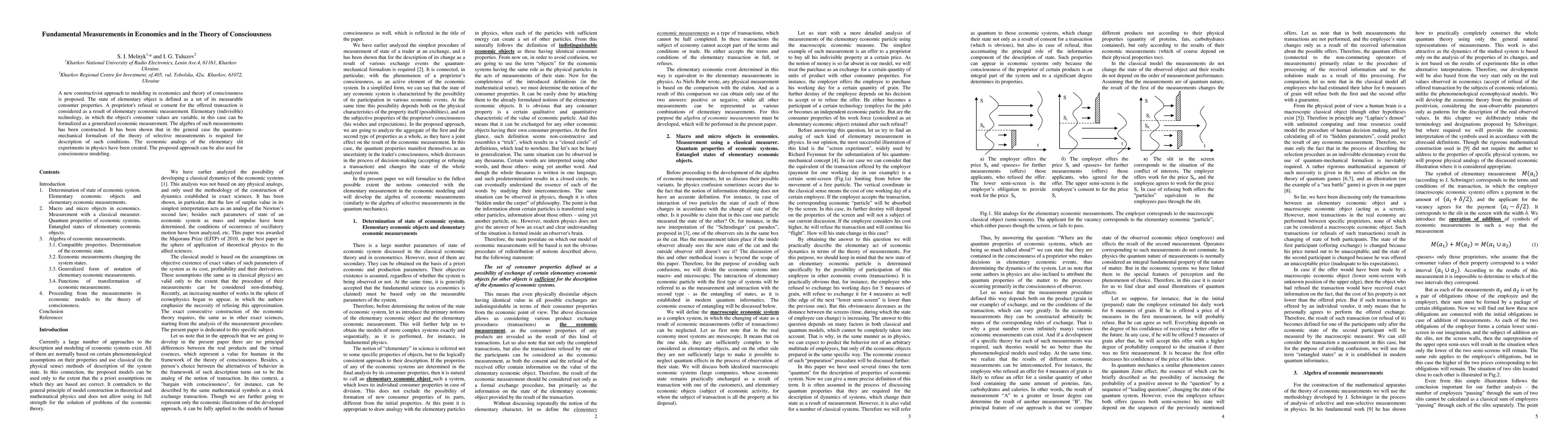 A new constructivist approach to modeling in economics and theory of consciousness is proposed. The state of elementary object is defined as a set of its measurable consumer properties. A proprietor's refusal or consent for the offered transaction is considered as a result of elementary economic measurement. Elementary (indivisible) technology, in which the object's consumer values are variable, in this case can be formalized as a generalized economic measurement. The algebra of such measurements has been constructed. It has been shown that in the general case the quantum-mechanical formalism of the theory of selective measurements is required for description of such conditions. The economic analogs of the elementary slit experiments in physics have been created. The proposed approach can be also used for consciousness modeling.