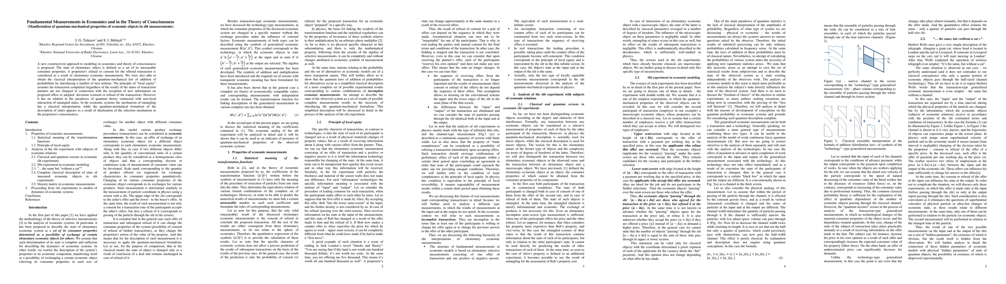 A new constructivist approach to modeling in economics and theory of consciousness is proposed. The state of elementary object is defined as a set of its measurable consumer properties. A proprietor's refusal or consent for the offered transaction is considered as a result of elementary economic measurement. We were also able to obtain the classical interpretation of the quantum-mechanical law of addition of probabilities by introducing a number of new notions. The principle of "local equity" assumes the transaction completed (regardless of the result) of the states of transaction partners are not changed in connection with the reception of new information on proposed offers or adopted decisions (consent or refusal of the transaction). However it has no relation to the paradoxes of quantum theory connected with non-local interaction of entangled states. In the economic systems the mechanism of entangling has a classical interpretation, while the quantum-mechanical formalism of the description of states appears as a result of idealization of the selection mechanism in the proprietor's consciousness.