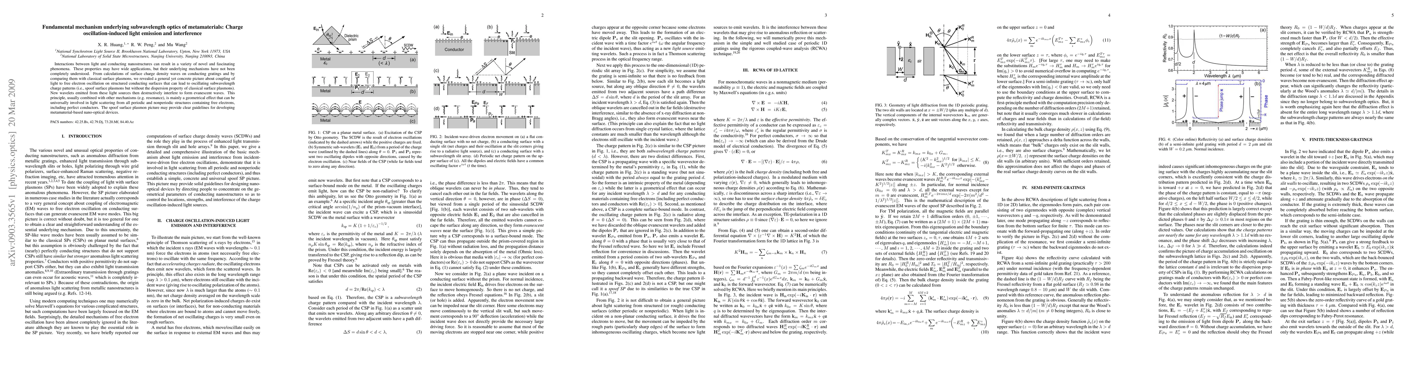 Interactions between light and conducting nanostructures can result in a variety of novel and fascinating phenomena. These properties may have wide applications, but their underlying mechanisms have not been completely understood. From calculations of surface charge density waves on conducting gratings and by comparing them with classical surface plasmons, we revealed a general yet concrete picture about coupling of light to free electron oscillation on structured conducting surfaces that can lead to oscillating subwavelength charge patterns (i.e., spoof surface plasmons but without the dispersion property of classical surface plasmons). New wavelets emitted from these light sources then destructively interfere to form evanescent waves. This principle, usually combined with other mechanisms (e.g. resonance), is mainly a geometrical effect that can be universally involved in light scattering from all periodic and nonperiodic structures containing free electrons, including perfect conductors. The spoof surface plasmon picture may provide clear guidelines for developing metamaterial-based nano-optical devices.