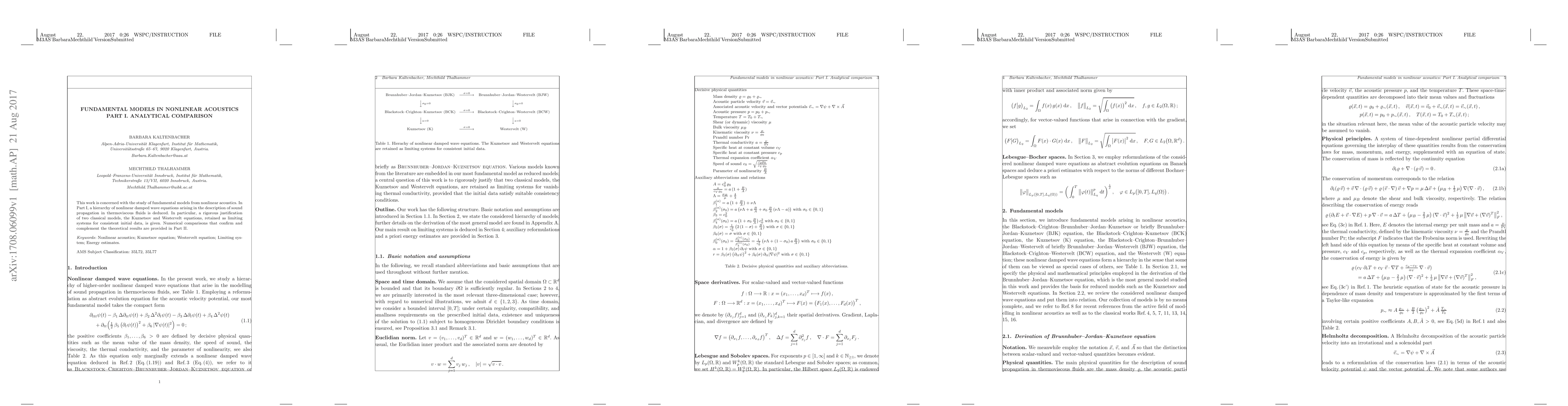 This work is concerned with the study of fundamental models from nonlinear acoustics. In Part~I, a hierarchy of nonlinear damped wave equations arising in the description of sound propagation in thermoviscous fluids is deduced. In particular, a rigorous justification of two classical models, the Kuznetsov and Westervelt equations, retained as limiting systems for consistent initial data, is given. Numerical comparisons that confirm and complement the theoretical results are provided in Part~II.