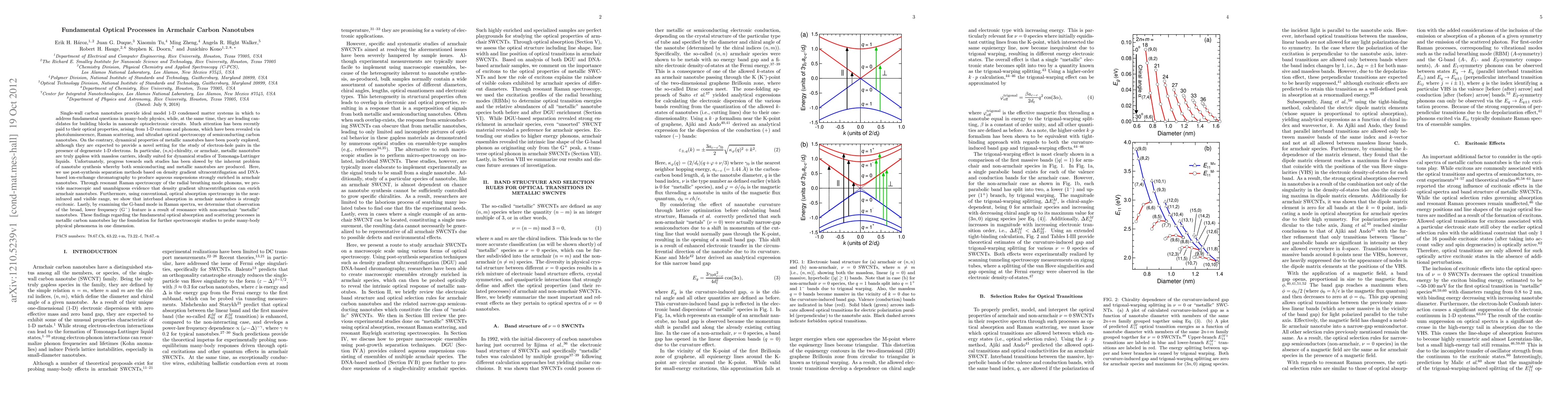 This study employs ultracentrifugation and DNA-chromatography to enrich aqueous suspensions of armchair carbon nanotubes, demonstrating through Raman and optical absorption spectroscopy that their optical properties are distinctly excitonic. The research also reveals that a broad G^{-} Raman feature results from resonance with non-armchair metallic nanotubes.