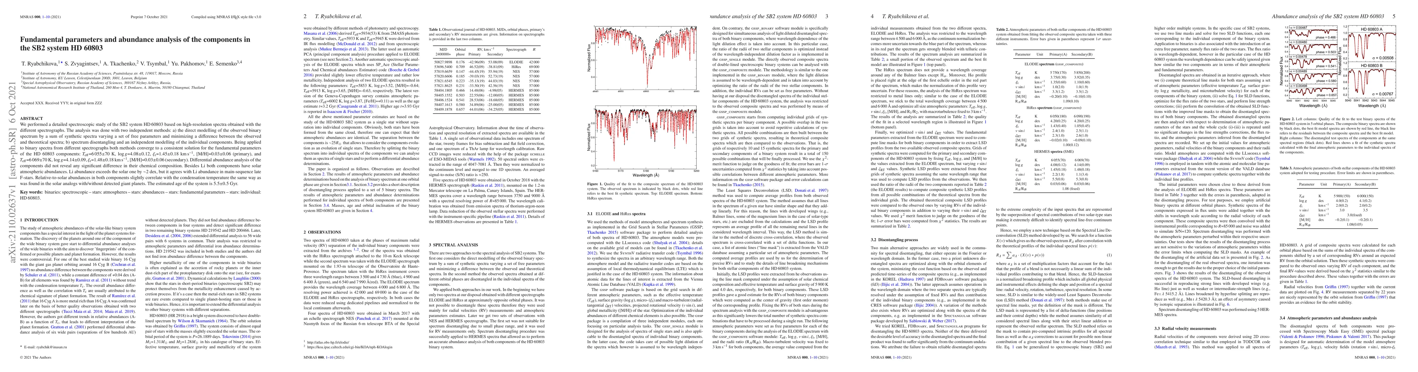 A spectroscopic study of the SB2 system HD 60803 reveals consistent fundamental parameters for both stars, including temperatures, surface gravities, and metallicities, with no significant difference in their chemical composition. The estimated age of the system is 5.5 billion years.