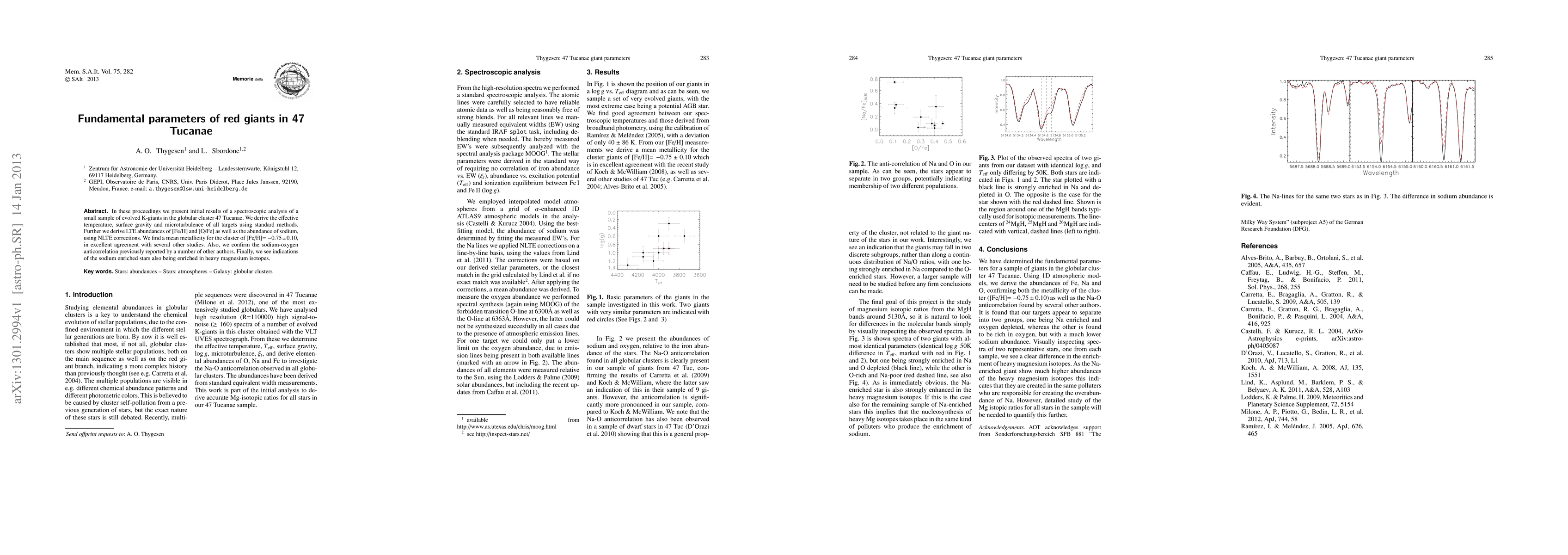In these proceedings we present initial results of a spectroscopic analysis of a small sample of evolved K-giants in the globular cluster 47 Tucanae. We derive the effective temperature, surface gravity and microturbulence of all targets using standard methods. Further we derive LTE abundances of [Fe/H] and [O/Fe] as well as the abundance of sodium, using NLTE corrections. We find a mean metallicity for the cluster of [Fe/H]$=-0.75\pm0.10$, in excellent agreement with several other studies. Also, we confirm the sodium-oxygen anticorrelation previously reported by a number of other authors. Finally, we see indications of the sodium enriched stars also being enriched in heavy magnesium isotopes.