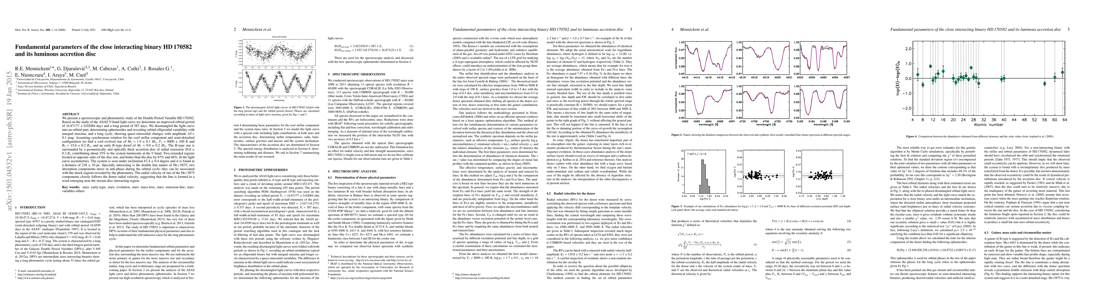 We present a spectroscopic and photometric study of the Double Period Variable HD170582. Based on the study of the ASAS V-band light curve we determine an improved orbital period of 16.87177 $\pm$ 0.02084 days and a long period of 587 days. We disentangled the light curve into an orbital part, determining ephemerides and revealing orbital ellipsoidal variability with unequal maxima, and a long cycle, showing quasi-sinusoidal changes with amplitude $\Delta V$= 0.1 mag. Assuming synchronous rotation for the cool stellar component and semi-detached configuration we find a cool evolved star of $M_{2}$ = 1.9 $\pm$ 0.1 $M_{\odot}$, $T_{2}$ = 8000 $\pm$ 100 $K$ and $R_{2}$ = 15.6 $\pm$ 0.2 $R_{\odot}$, and an early B-type dwarf of $M_{1}$ = 9.0 $\pm$ 0.2 $M_{\odot}$. The B-type star is surrounded by a geometrically and optically thick accretion disc of radial extension 20.8 $\pm$ 0.3 $R_{\odot}$ contributing about 35% to the system luminosity at the $V$ band. Two extended regions located at opposite sides of the disc rim, and hotter than the disc by 67% and 46%, fit the light curve asymmetries. The system is seen under inclination 67.4 $\pm$ 0.4 degree and it is found at a distance of 238 $\pm$ 10 pc. Specially interesting is the double line nature of HeI 5875; two absorption components move in anti-phase during the orbital cycle; they can be associated with the shock regions revealed by the photometry. The radial velocity of one of the HeI 5875 components closely follows the donor radial velocity, suggesting that the line is formed in a wind emerging near the stream-disc interacting region.