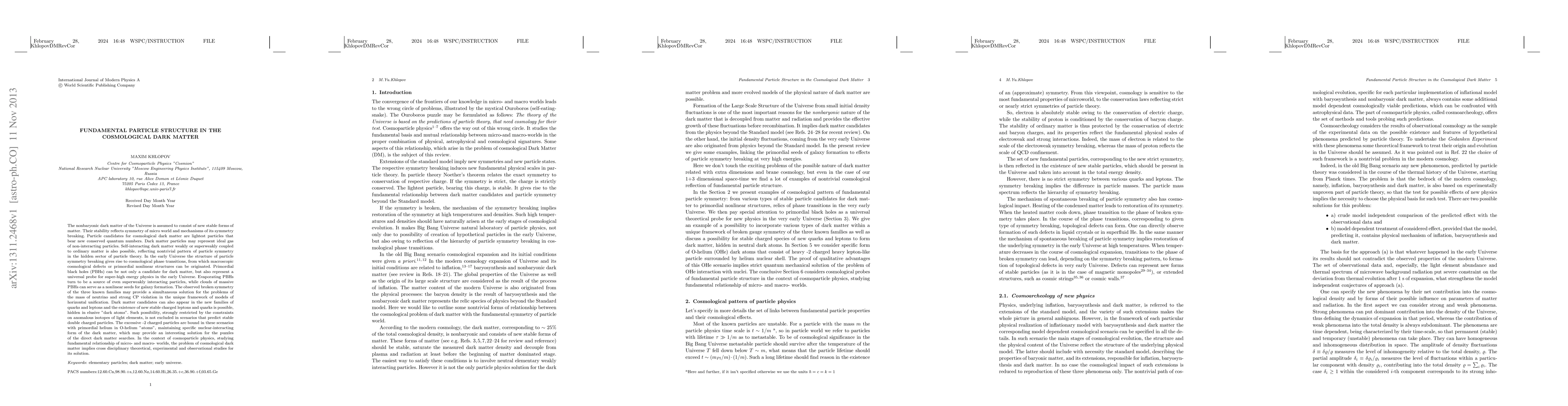 The nonbaryonic dark matter of the Universe is assumed to consist of new stable forms of matter. Their stability reflects symmetry of micro world and mechanisms of its symmetry breaking. Particle candidates for cosmological dark matter are lightest particles that bear new conserved quantum numbers. Dark matter particles may represent ideal gas of non-interacting particles. Self-interacting dark matter weakly or superweakly coupled to ordinary matter is also possible, reflecting nontrivial pattern of particle symmetry in the hidden sector of particle theory. In the early Universe the structure of particle symmetry breaking gives rise to cosmological phase transitions, from which macroscopic cosmological defects or primordial nonlinear structures can be originated. Primordial black holes (PBHs) can be not only a candidate for dark matter, but also represent a universal probe for super-high energy physics in the early Universe. Evaporating PBHs turn to be a source of even superweakly interacting particles, while clouds of massive PBHs can serve as a nonlinear seeds for galaxy formation. The observed broken symmetry of the three known families may provide a simultaneous solution for the problems of the mass of neutrino and strong CP violation in the unique framework of models of horizontal unification. The existence of new stable charged leptons and quarks is possible, hidden in elusive "dark atoms". Such possibility, strongly restricted by the constraints on anomalous isotopes of light elements, is not excluded in scenarios that predict stable double charged particles. The excessive -2 charged particles are bound in these scenarios with primordial helium in O-helium "atoms", maintaining specific nuclear-interacting form of the dark matter, which may provide an interesting solution for the puzzles of the direct dark matter searches. (abridged)
