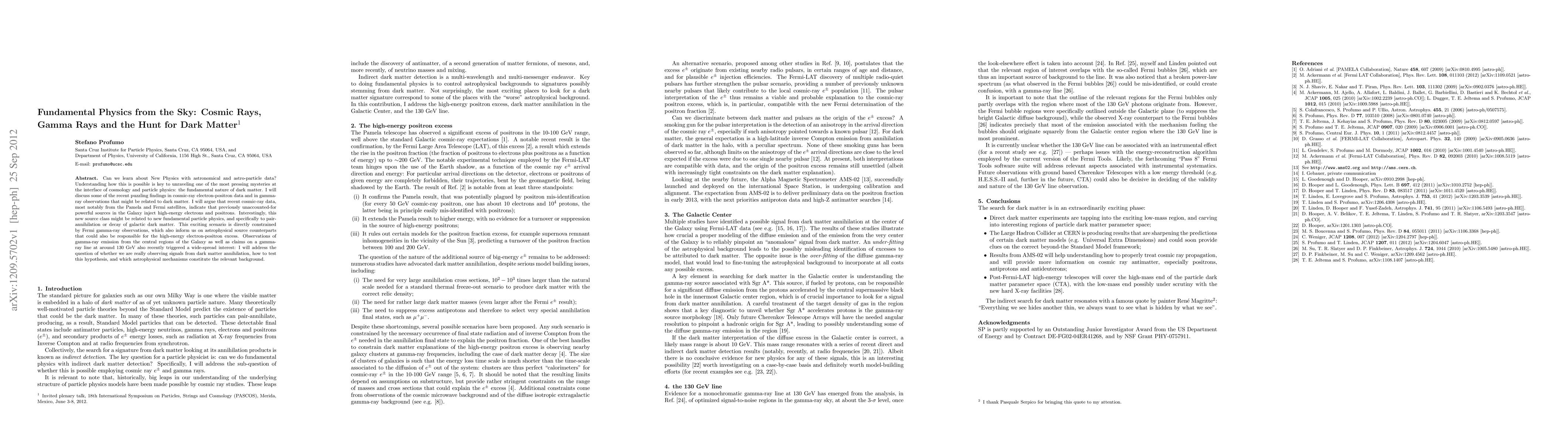 Can we learn about New Physics with astronomical and astro-particle data? Understanding how this is possible is key to unraveling one of the most pressing mysteries at the interface of cosmology and particle physics: the fundamental nature of dark matter. I will discuss some of the recent puzzling findings in cosmic-ray electron-positron data and in gamma-ray observations that might be related to dark matter. I will argue that recent cosmic-ray data, most notably from the Pamela and Fermi satellites, indicate that previously unaccounted-for powerful sources in the Galaxy inject high-energy electrons and positrons. Interestingly, this new source class might be related to new fundamental particle physics, and specifically to pair-annihilation or decay of galactic dark matter. This exciting scenario is directly constrained by Fermi gamma-ray observations, which also inform us on astrophysical source counterparts that could also be responsible for the high-energy electron-positron excess. Observations of gamma-ray emission from the central regions of the Galaxy as well as claims on a gamma-ray line at around 130 GeV also recently triggered a wide-spread interest: I will address the question of whether we are really observing signals from dark matter annihilation, how to test this hypothesis, and which astrophysical mechanisms constitute the relevant background.