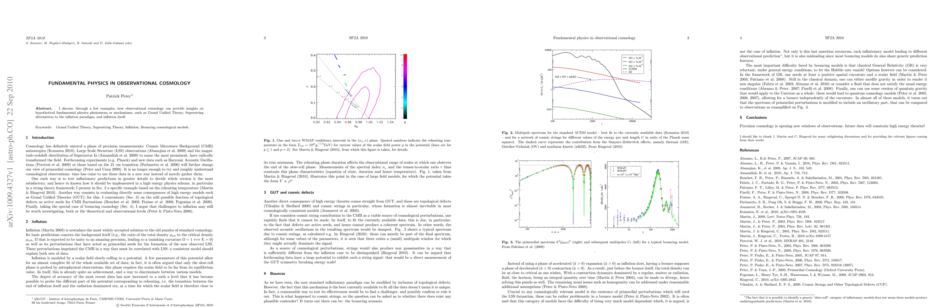 This paper explores how observational cosmology can offer insights into fundamental physics, including Grand Unified Theory, superstring theories, and alternative inflation models, by analyzing specific examples. The study highlights the potential of cosmological observations to test and refine these theoretical frameworks.