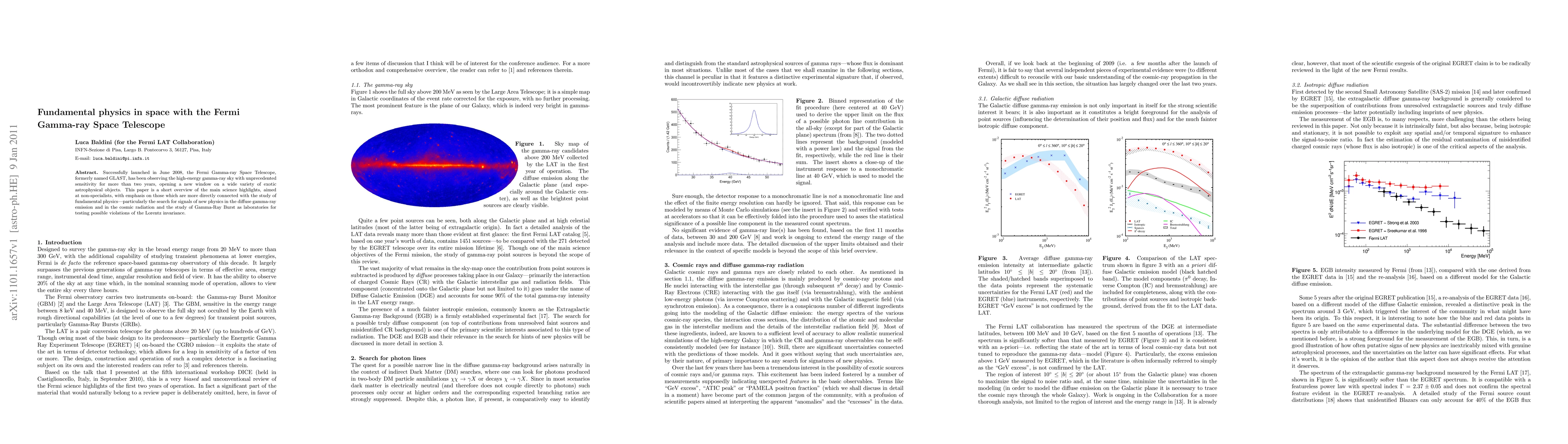 Successfully launched in June 2008, the Fermi Gamma-ray Space Telescope, formerly named GLAST, has been observing the high-energy gamma-ray sky with unprecedented sensitivity for more than two years, opening a new window on a wide variety of exotic astrophysical objects. This paper is a short overview of the main science highlights, aimed at non-specialists, with emphasis on those which are more directly connected with the study of fundamental physics---particularly the search for signals of new physics in the diffuse gamma-ray emission and in the cosmic radiation and the study of Gamma-Ray Burst as laboratories for testing possible violations of the Lorentz invariance.