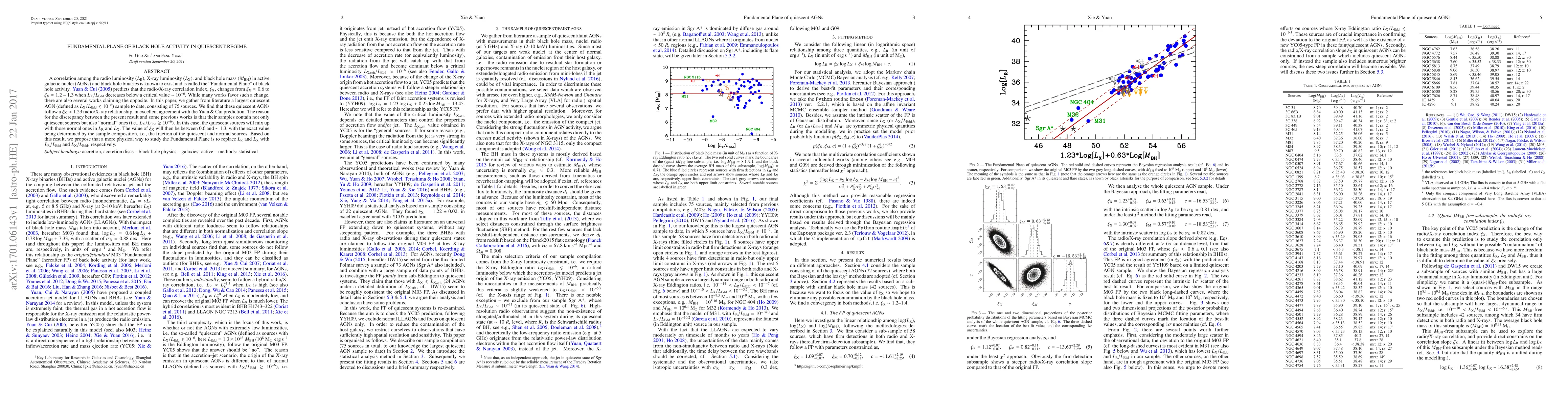 A correlation among the radio luminosity ($L_{\rm R}$), X-ray luminosity ($L_{\rm X}$), and black hole mass ($M_{\rm BH}$) in active galactic nuclei (AGNs) and black hole binaries is known to exist and is called the "Fundamental Plane" of black hole activity. Yuan & Cui (2005) predicts that the radio/X-ray correlation index, $\xi_{\rm X}$, changes from $\xi_{\rm X}\approx 0.6$ to $\xi_{\rm X}\approx 1.2-1.3$ when $L_{\rm X}/L_{\rm Edd}$ decreases below a critical value $\sim 10^{-6}$. While many works favor such a change, there are also several works claiming the opposite. In this paper, we gather from literature a largest quiescent AGN (defined as $L_{\rm X}/L_{\rm Edd} < 10^{-6}$) sample to date, consisting of $75$ sources. We find that these quiescent AGNs follow a $\xi_{\rm X}\approx 1.23$ radio/X-ray relationship, in excellent agreement with the Yuan \& Cui prediction. The reason for the discrepancy between the present result and some previous works is that their samples contain not only quiescent sources but also "normal" ones (i.e., $L_{\rm X}/L_{\rm Edd} > 10^{-6}$). In this case, the quiescent sources will mix up with those normal ones in $L_{\rm R}$ and $L_{\rm X}$. The value of $\xi_{\rm X}$ will then be between $0.6$ and $\sim1.3$, with the exact value being determined by the sample composition, i.e., the fraction of the quiescent and normal sources. Based on this result, we propose that a more physical way to study the Fundamental Plane is to replace $L_{\rm R}$ and $L_{\rm X}$ with $L_{\rm R}/L_{\rm Edd}$ and $L_{\rm X}/L_{\rm Edd}$, respectively.