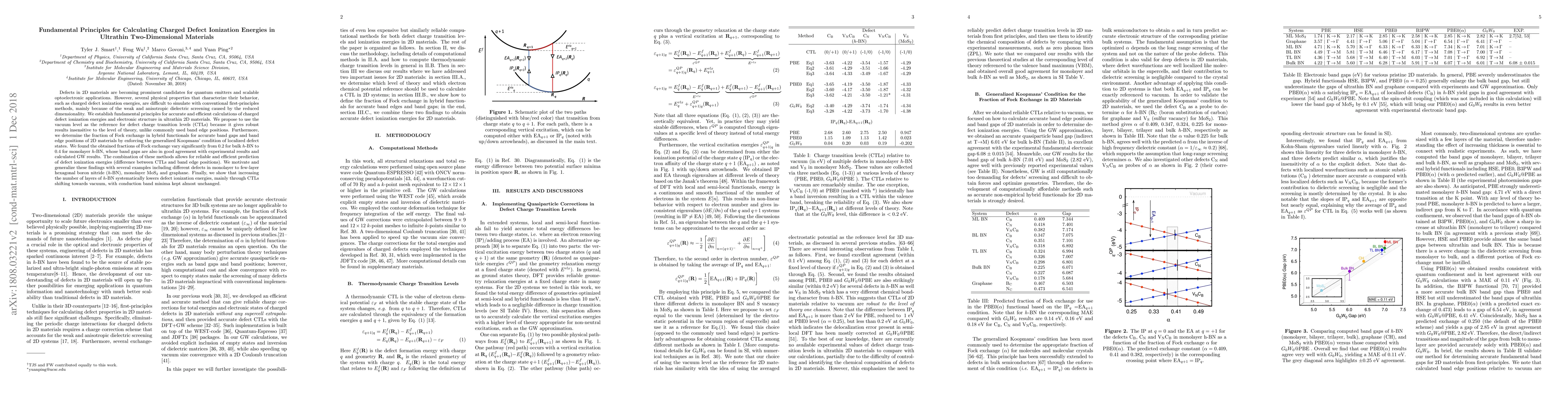 This paper establishes fundamental principles for calculating charged defect ionization energies in ultrathin 2D materials, proposing to use the vacuum level as the reference for defect charge transition levels for robust results. It also determines optimal fractions of Fock exchange in hybrid functionals to accurately predict band gaps and defect ionization energies, demonstrating these methods through examples in $h$-BN, MoS$_2$, and graphane.