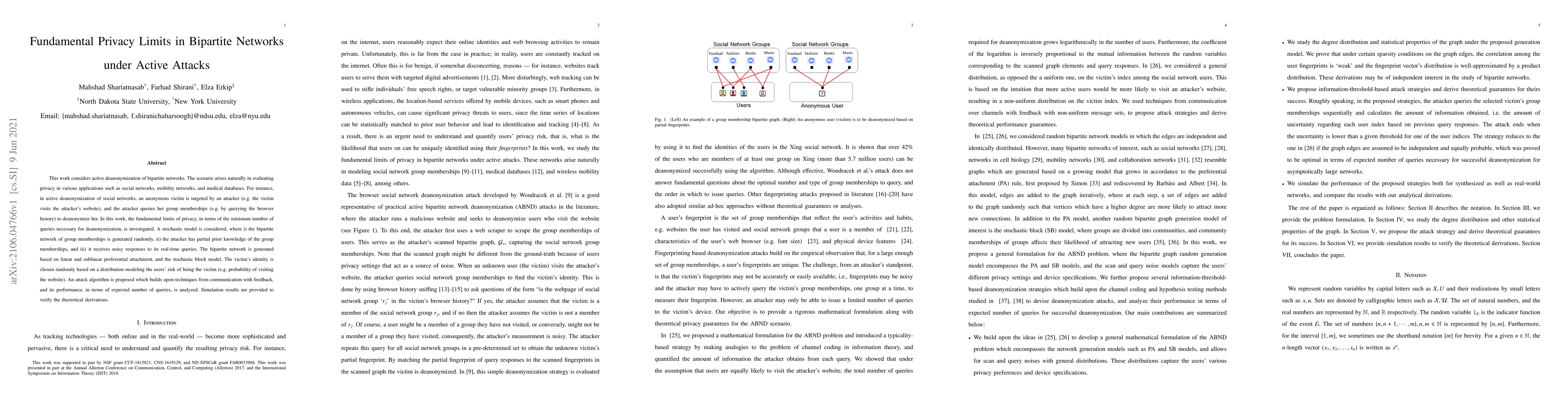 This work considers active deanonymization of bipartite networks. The scenario arises naturally in evaluating privacy in various applications such as social networks, mobility networks, and medical databases. For instance, in active deanonymization of social networks, an anonymous victim is targeted by an attacker (e.g. the victim visits the attacker's website), and the attacker queries her group memberships (e.g. by querying the browser history) to deanonymize her. In this work, the fundamental limits of privacy, in terms of the minimum number of queries necessary for deanonymization, is investigated. A stochastic model is considered, where i) the bipartite network of group memberships is generated randomly, ii) the attacker has partial prior knowledge of the group memberships, and iii) it receives noisy responses to its real-time queries. The bipartite network is generated based on linear and sublinear preferential attachment, and the stochastic block model. The victim's identity is chosen randomly based on a distribution modeling the users' risk of being the victim (e.g. probability of visiting the website). An attack algorithm is proposed which builds upon techniques from communication with feedback, and its performance, in terms of expected number of queries, is analyzed. Simulation results are provided to verify the theoretical derivations.