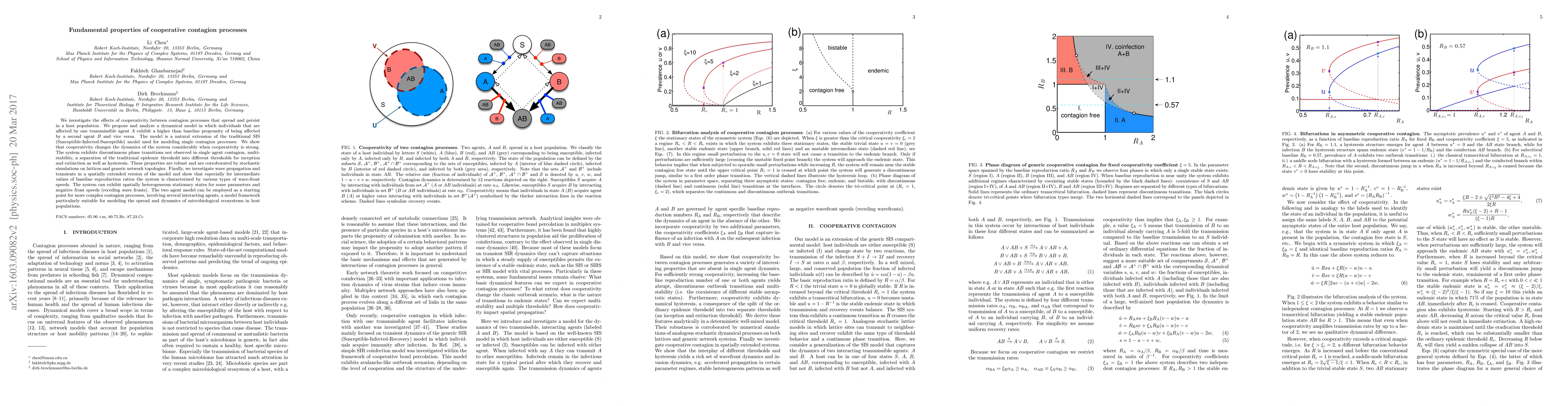 We investigate the effects of cooperativity between contagion processes that spread and persist in a host population. We propose and analyze a dynamical model in which individuals that are affected by one transmissible agent $A$ exhibit a higher than baseline propensity of being affected by a second agent $B$ and vice versa. The model is a natural extension of the traditional SIS (Susceptible-Infected-Susceptible) model used for modeling single contagion processes. We show that cooperativity changes the dynamics of the system considerably when cooperativity is strong. The system exhibits discontinuous phase transitions not observed in single agent contagion, multi-stability, a separation of the traditional epidemic threshold into different thresholds for inception and extinction as well as hysteresis. These properties are robust and are corroborated by stochastic simulations on lattices and generic network topologies. Finally, we investigate wave propagation and transients in a spatially extended version of the model and show that especially for intermediate values of baseline reproduction ratios the system is characterized by various types of wave-front speeds. The system can exhibit spatially heterogeneous stationary states for some parameters and negative front speeds (receding wave fronts). The two agent model can be employed as a starting point for more complex contagion processes, involving several interacting agents, a model framework particularly suitable for modeling the spread and dynamics of microbiological ecosystems in host populations.