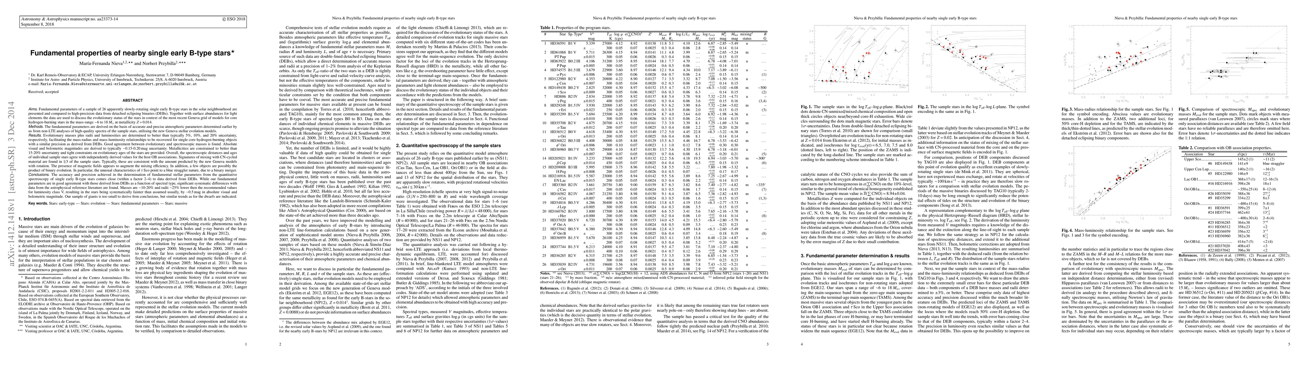This paper presents fundamental parameters for 26 nearby single early B-type stars, comparing them to high-precision data from eclipsing binaries. The study finds good agreement between evolutionary and spectroscopic masses, and reveals systematic differences in stellar masses, radii, and magnitudes compared to literature values.