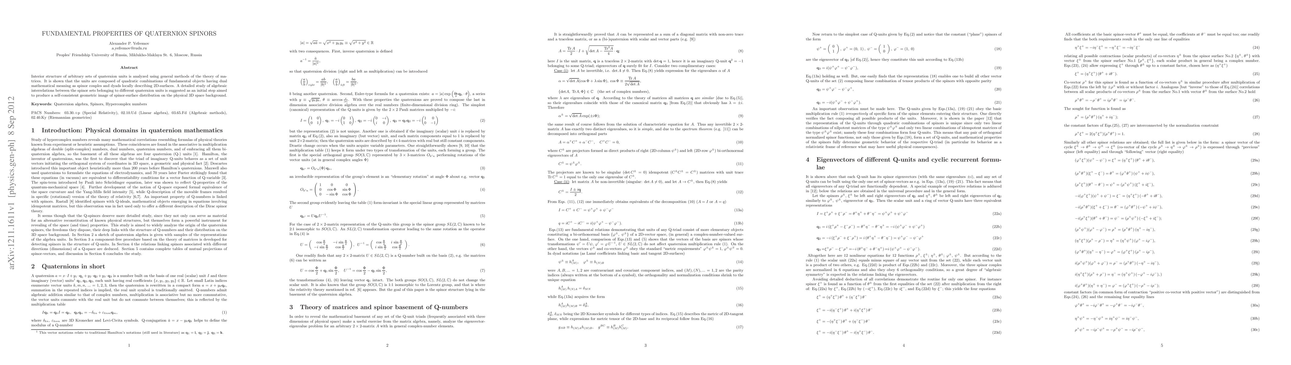 This paper analyzes the structure of quaternion units using matrix methods, revealing quadratic combinations of spinor couples and dyads that describe 2D surfaces. It proposes a study of algebraic relationships between spinors from different units to create a self-consistent geometric image of spinor distributions in 3D space.