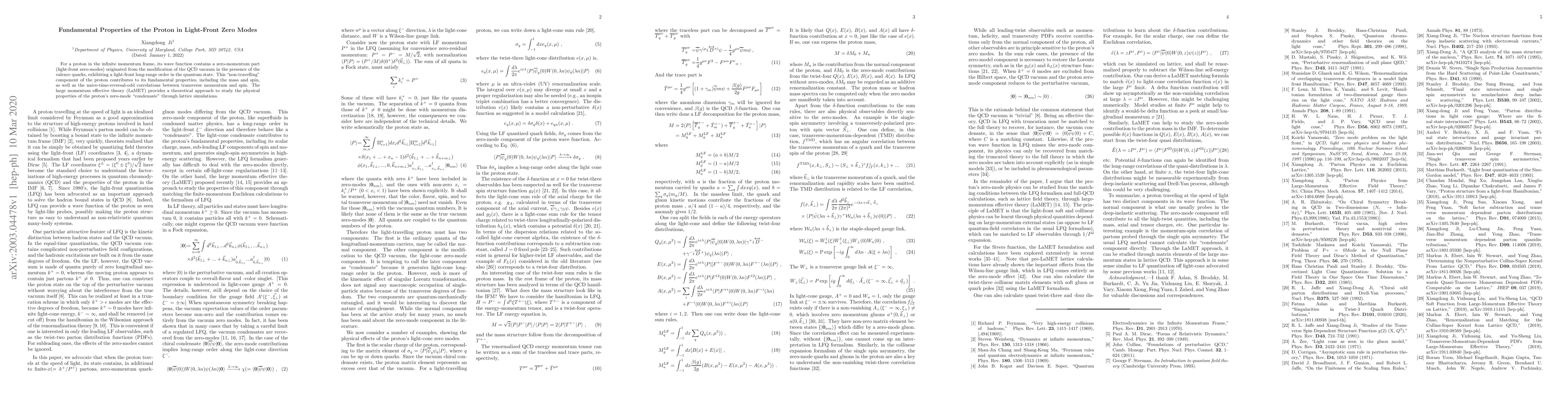Researchers studied the proton's light-front zero modes, a part of its wave function that affects its mass, spin, and interactions. They used a theoretical approach called LaMET to better understand these properties.