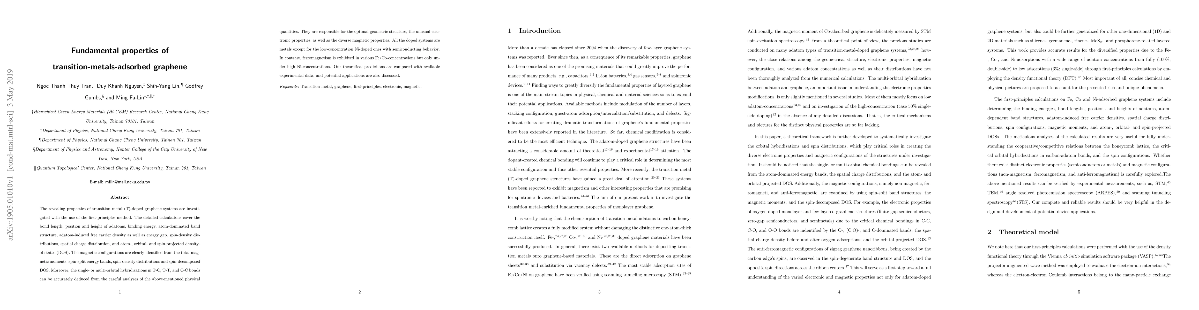 The revealing properties of transition metal (T)-doped graphene systems are investigated with the use of the first-principles method. The detailed calculations cover the bond length, position and height of adatoms, binding energy, atom-dominated band structure, adatom-induced free carrier density as well as energy gap, spin-density distributions, spatial charge distribution, and atom-, orbital- and spin-projected density-of-states (DOS). The magnetic configurations are clearly identified from the total magnetic moments, spin-split energy bands, spin-density distributions and spin-decomposed DOS. Moreover, the single- or multi-orbital hybridizations in T-C, T-T, and C-C bonds can be accurately deduced from the careful analyses of the above-mentioned physical quantities. They are responsible for the optimal geometric structure, the unusual electronic properties, as well as the diverse magnetic properties. All the doped systems are metals except for the low-concentration Ni-doped ones with semiconducting behavior. In contrast, ferromagnetism is exhibited in various Fe/Co-concentrations but only under high Ni-concentrations. Our theoretical predictions are compared with available experimental data, and potential applications are also discussed.