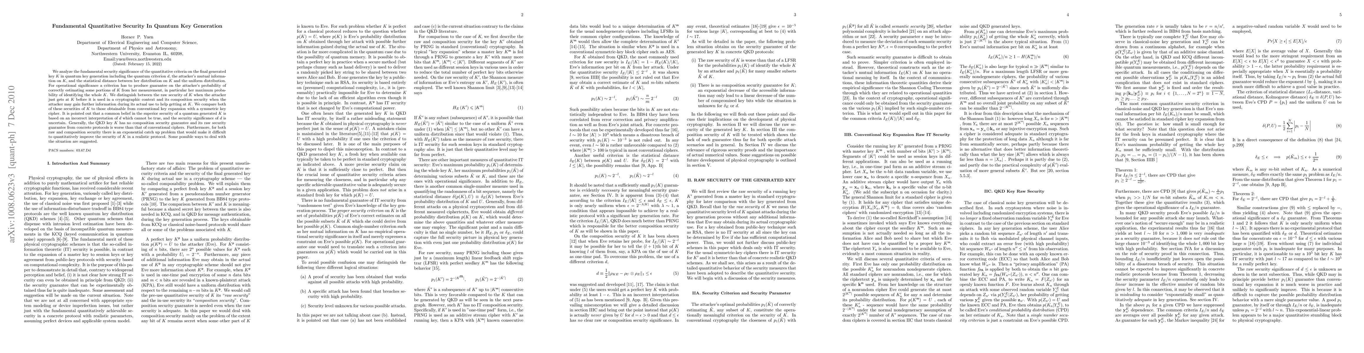 We analyze the fundamental security significance of the quantitative criteria on the final generated key K in quantum key generation including the quantum criterion d, the attacker's mutual information on K, and the statistical distance between her distribution on K and the uniform distribution. For operational significance a criterion has to produce guarantee on the attacker's probability of correctly estimating some portion of K from her measurement, in particular her maximum probability of identifying the whole K. We distinguish between the raw security of K when the attacker just gets at K before it is used in a cryptographic context and its composition security when the attacker may gain further information during its actual use to help getting at K. We compare both of these securities of K to those obtainable from conventional key expansion with a symmetric key cipher. It is pointed out that a common belief in the superior security of a quantum generated K is based on an incorrect interpretation of d which cannot be true, and the security significance of d is uncertain. Generally, the QKD key K has no composition security guarantee and its raw security guarantee from concrete protocols is worse than that of conventional ciphers. Furthermore, for both raw and composition security there is an exponential catch up problem that would make it difficult to quantitatively improve the security of K in a realistic protocol. Some possible ways to deal with the situation are suggested.