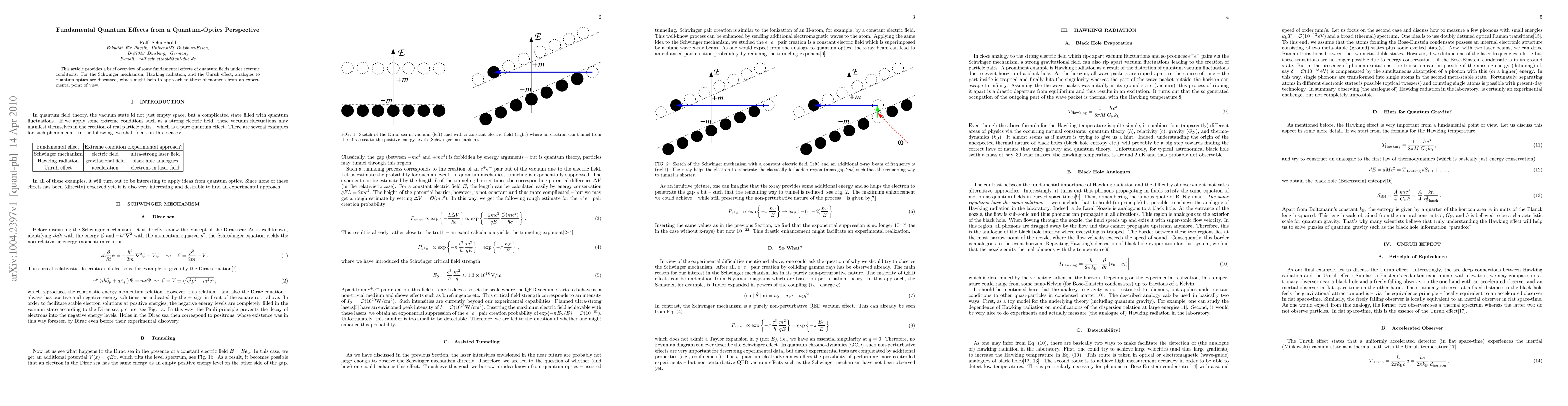 This paper explores fundamental quantum effects like the Schwinger mechanism, Hawking radiation, and the Unruh effect through a quantum-optics lens, aiming to provide experimental approaches for their study. Analogies drawn from quantum optics may facilitate better understanding and practical observation of these quantum phenomena.