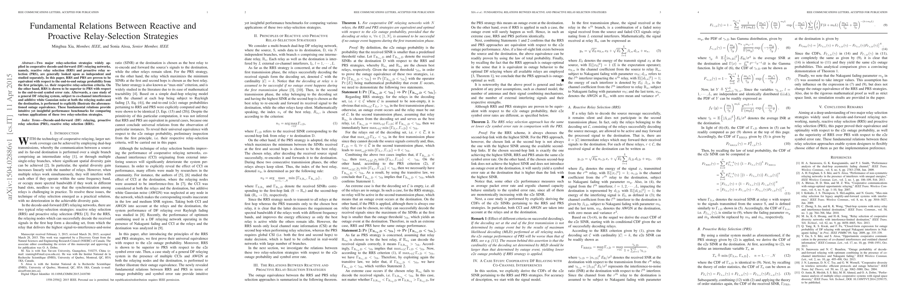 Two major relay-selection strategies widely applied in cooperative decode-and-forward (DF) relaying networks, namely, reactive relay selection (RRS) and proactive relay selection (PRS), are generally looked upon as independent and studied separately. In this paper, RRS and PRS are proven to be equivalent with respect to the end-to-end outage probability from the first principle, i.e. their respective relay-selection criteria. On the other hand, RRS is shown to be superior to PRS with respect to the end-to-end symbol error rate. Afterwards, a case study of a general DF relaying system, subject to co-channel interferences and additive white Gaussian noise at both the relaying nodes and the destination, is performed to explicitly illustrate the aforementioned outage equivalence. These fundamental relations provide intuitive yet insightful performance benchmarks for comparing various applications of these two relay-selection strategies.