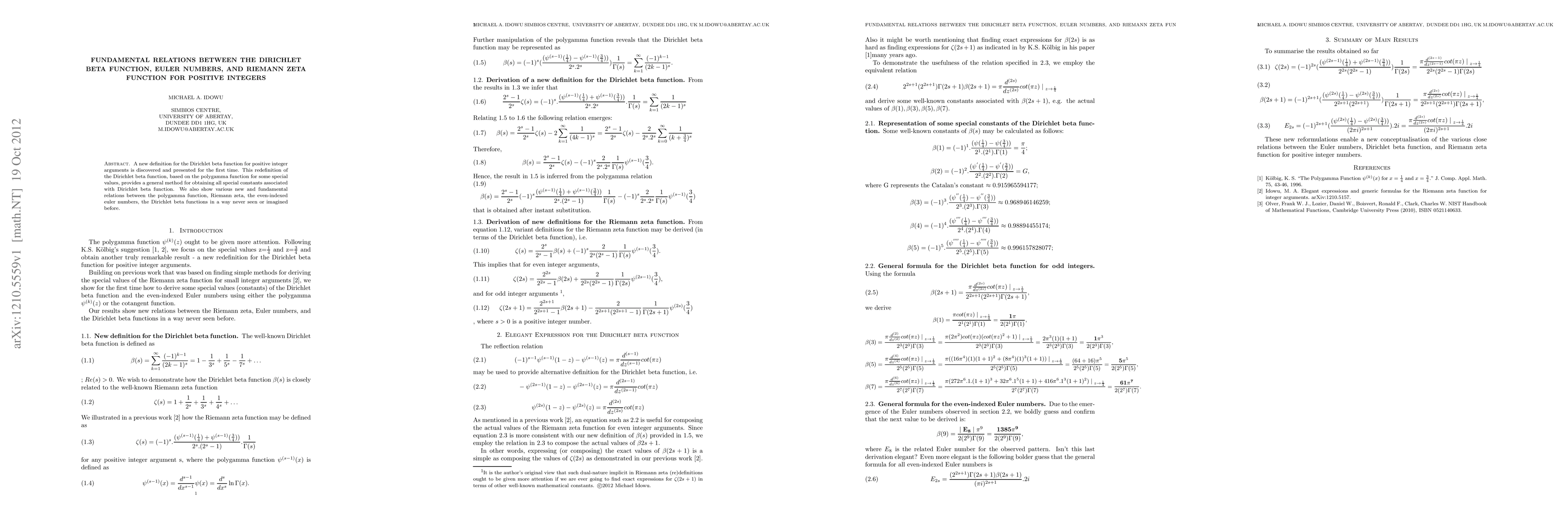 Researchers redefined the Dirichlet beta function using the polygamma function, revealing fundamental relations with the Riemann zeta function and Euler numbers, providing a new method for finding special constants associated with the Dirichlet beta function.