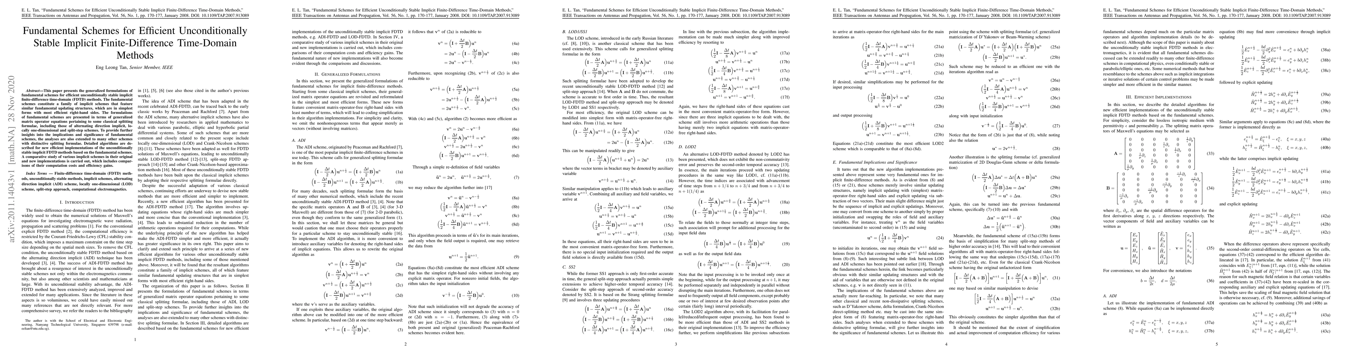 This paper presents the generalized formulations of fundamental schemes for efficient unconditionally stable implicit finite-difference time-domain (FDTD) methods. The fundamental schemes constitute a family of implicit schemes that feature similar fundamental updating structures, which are in simplest forms with most efficient right-hand sides. The formulations of fundamental schemes are presented in terms of generalized matrix operator equations pertaining to some classical splitting formulae, including those of alternating direction implicit, locally one-dimensional and split-step schemes. To provide further insights into the implications and significance of fundamental schemes, the analyses are also extended to many other schemes with distinctive splitting formulae. Detailed algorithms are described for new efficient implementations of the unconditionally stable implicit FDTD methods based on the fundamental schemes. A comparative study of various implicit schemes in their original and new implementations is carried out, which includes comparisons of their computation costs and efficiency gains.