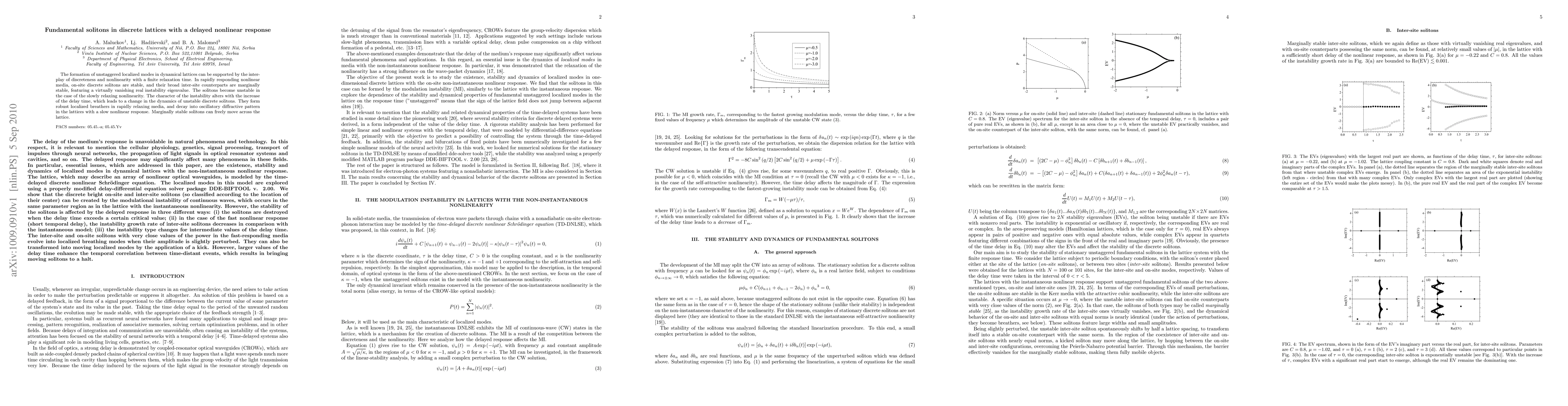 This paper investigates the stability and dynamics of solitons in discrete lattices with delayed nonlinear responses, showing that rapid relaxation supports stable on-site solitons while slow relaxation leads to instability and transformation into oscillatory patterns. Marginally stable solitons can traverse the lattice unaffected.