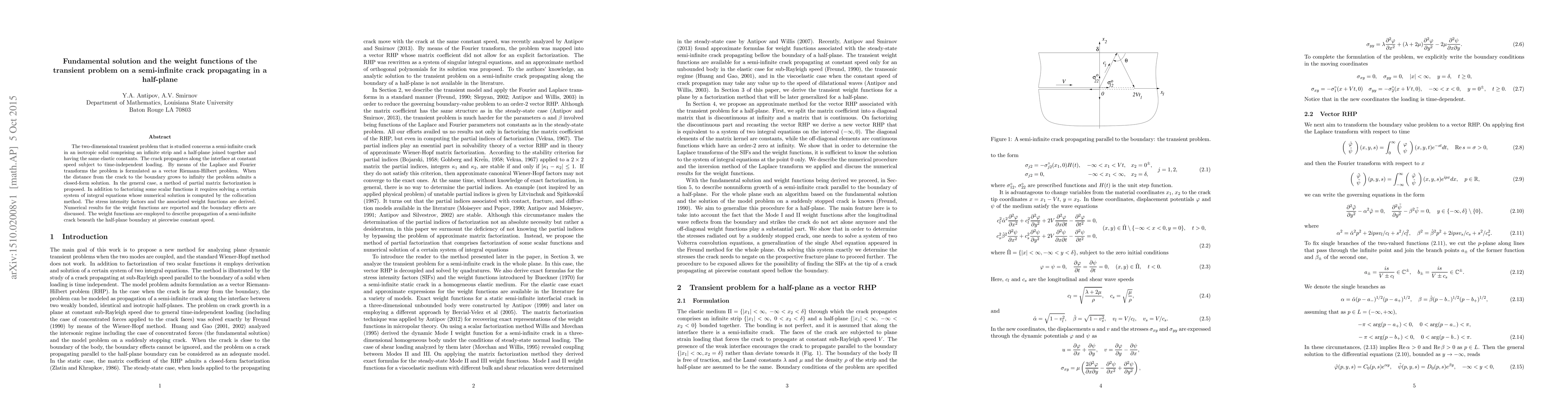 The two-dimensional transient problem that is studied concerns a semi-infinite crack in an isotropic solid comprising an infinite strip and a half-plane joined together and having the same elastic constants. The crack propagates along the interface at constant speed subject to time-independent loading. By means of the Laplace and Fourier transforms the problem is formulated as a vector Riemann-Hilbert problem. When the distance from the crack to the boundary grows to infinity the problem admits a closed-form solution. In the general case, a method of partial matrix factorization is proposed. In addition to factorizing some scalar functions it requires solving a certain system of integral equations whose numerical solution is computed by the collocation method. The stress intensity factors and the associated weight functions are derived. Numerical results for the weight functions are reported and the boundary effects are discussed. The weight functions are employed to describe propagation of a semi-infinite crack beneath the half-plane boundary at piecewise constant speed.