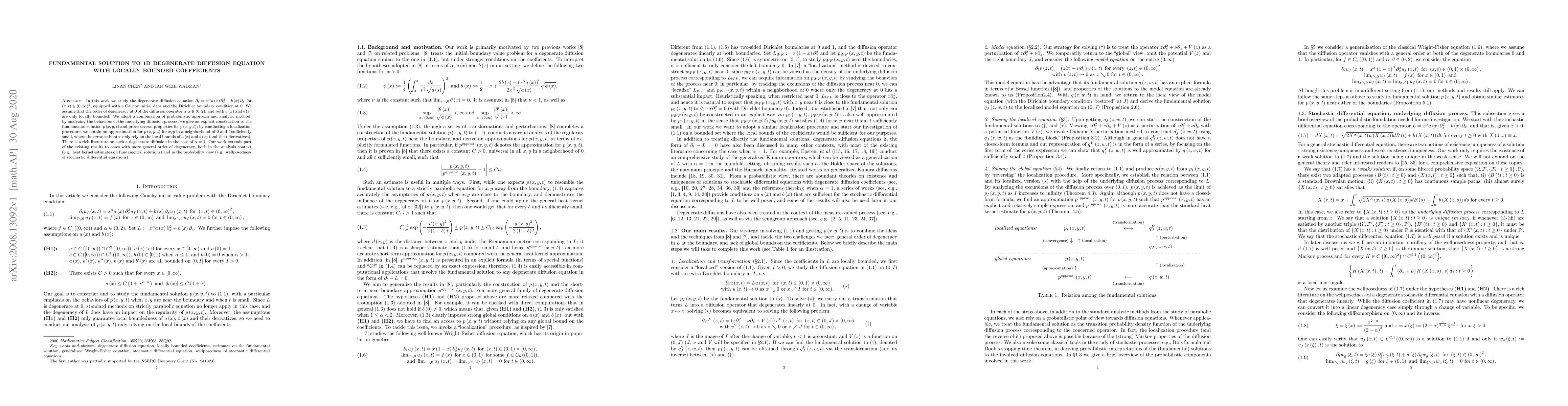 In this work we study the degenerate diffusion equation $\partial_{t}=x^{\alpha}a\left(x\right)\partial_{x}^{2}+b\left(x\right)\partial_{x}$ for $\left(x,t\right)\in\left(0,\infty\right)^{2}$, equipped with a Cauchy initial data and the Dirichlet boundary condition at $0$. We assume that the order of degeneracy at 0 of the diffusion operator is $\alpha\in\left(0,2\right)$, and both $a\left(x\right)$ and $b\left(x\right)$ are only locally bounded. We adopt a combination of probabilistic approach and analytic method: by analyzing the behaviors of the underlying diffusion process, we give an explicit construction to the fundamental solution $p\left(x,y,t\right)$ and prove several properties for $p\left(x,y,t\right)$; by conducting a localization procedure, we obtain an approximation for $p\left(x,y,t\right)$ for $x,y$ in a neighborhood of 0 and $t$ sufficiently small, where the error estimates only rely on the local bounds of $a\left(x\right)$ and $b\left(x\right)$ (and their derivatives). There is a rich literature on such a degenerate diffusion in the case of $\alpha=1$. Our work extends part of the existing results to cases with more general order of degeneracy, both in the analysis context (e.g., heat kernel estimates on fundamental solutions) and in the probability view (e.g., wellposedness of stochastic differential equations).