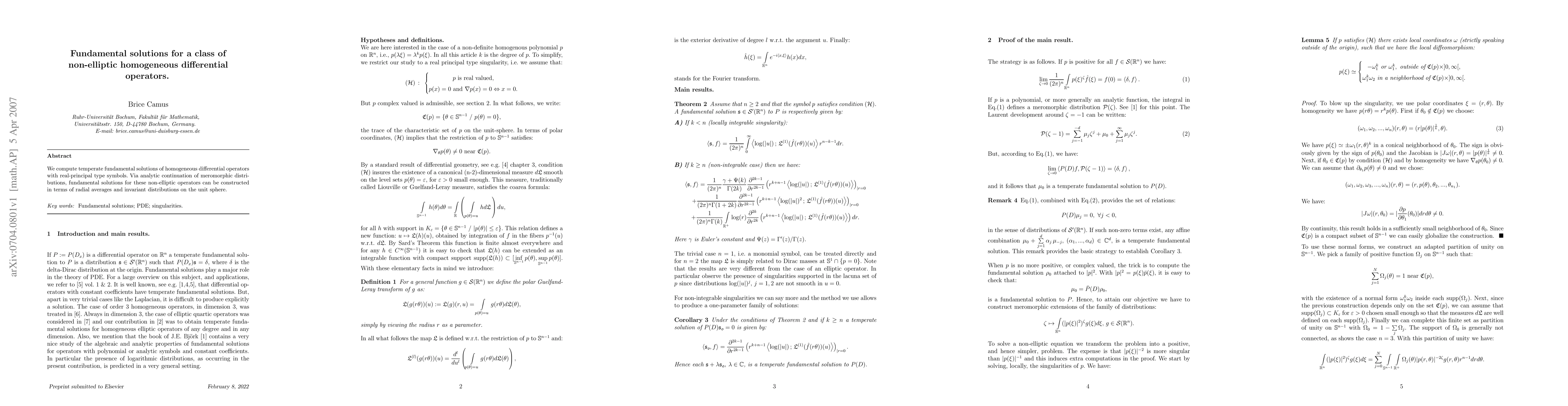 This paper computes temperate fundamental solutions for a class of non-elliptic homogeneous differential operators using real-principal type symbols. It constructs these solutions via analytic continuation of meromorphic distributions, employing radial averages and invariant distributions on the unit sphere.
