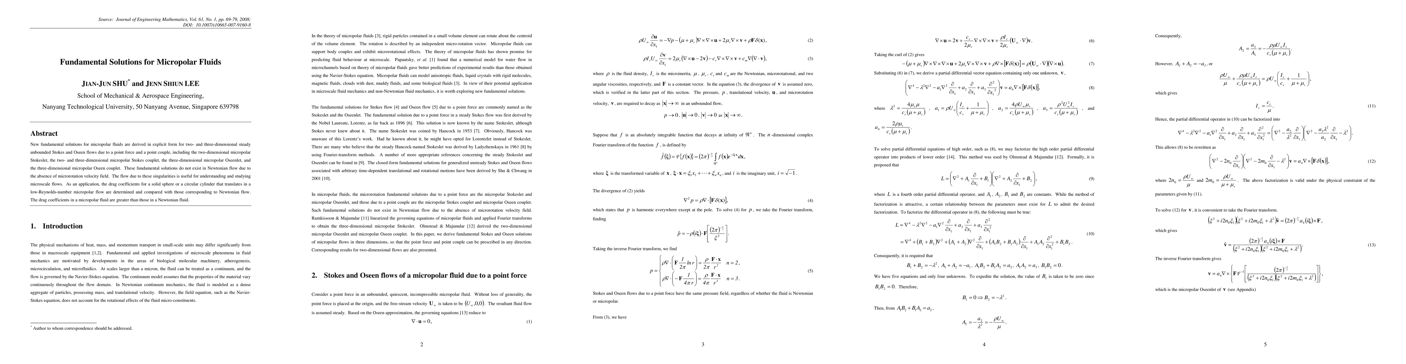This paper derives explicit fundamental solutions for micropolar fluid flows, including various singularities like Stokeslets and Oseenlets, which are absent in Newtonian fluid dynamics due to the presence of microrotation. The study also compares drag coefficients for micropolar flows around spheres and cylinders, finding higher drag in micropolar fluids compared to Newtonian fluids.