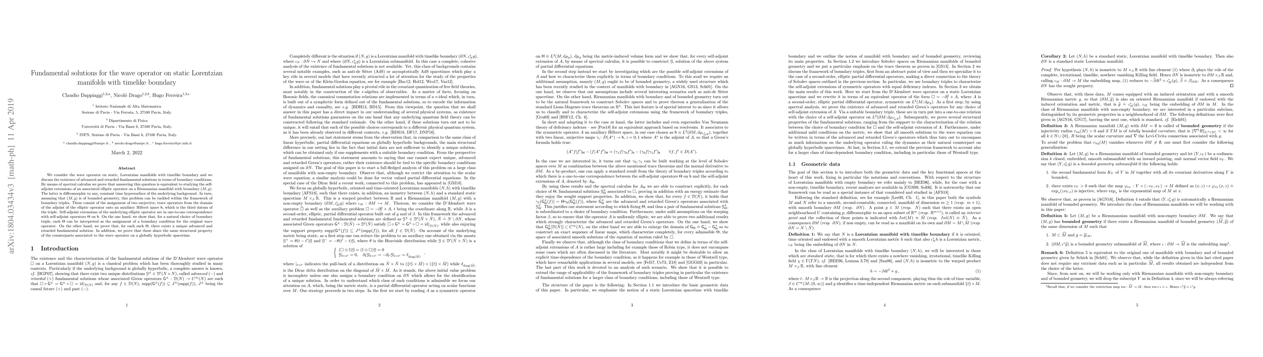 We consider the wave operator on static, Lorentzian manifolds with timelike boundary and we discuss the existence of advanced and retarded fundamental solutions in terms of boundary conditions. By means of spectral calculus we prove that answering this question is equivalent to studying the self-adjoint extensions of an associated elliptic operator on a Riemannian manifold with boundary $(M,g)$. The latter is diffeomorphic to any, constant time hypersurface of the underlying background. In turn, assuming that $(M,g)$ is of bounded geometry, this problem can be tackled within the framework of boundary triples. These consist of the assignment of two surjective, trace operators from the domain of the adjoint of the elliptic operator into an auxiliary Hilbert space $\mathsf{h}$, which is the third datum of the triple. Self-adjoint extensions of the underlying elliptic operator are in one-to-one correspondence with self-adjoint operators $\Theta$ on $\mathsf{h}$. On the one hand, we show that, for a natural choice of boundary triple, each $\Theta$ can be interpreted as the assignment of a boundary condition for the original wave operator. On the other hand, we prove that, for each such $\Theta$, there exists a unique advanced and retarded fundamental solution. In addition, we prove that these share the same structural property of the counterparts associated to the wave operator on a globally hyperbolic spacetime.