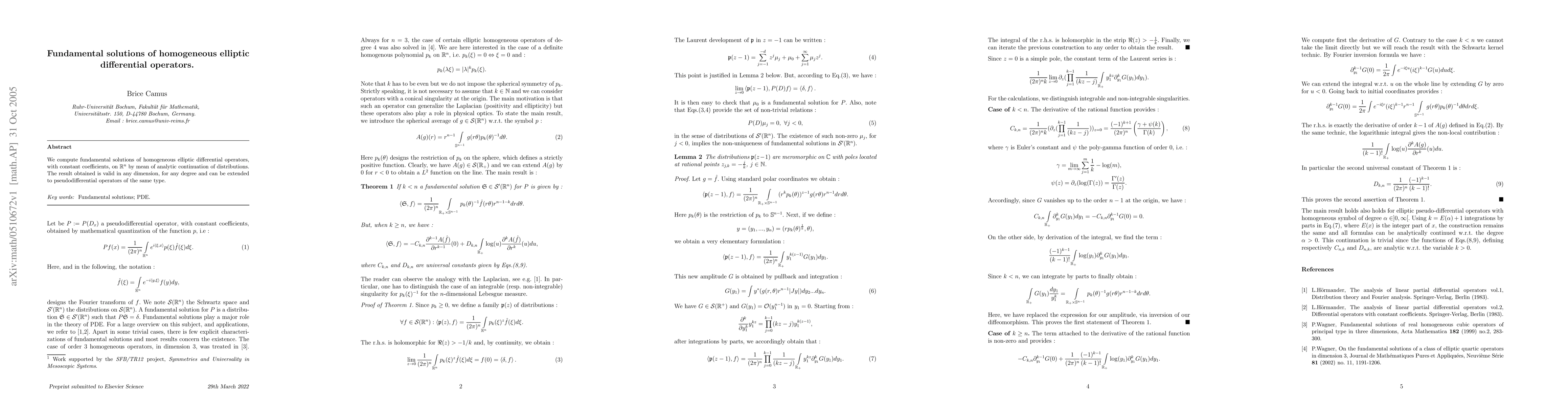 This paper computes fundamental solutions for homogeneous elliptic differential operators with constant coefficients on $\mathbb{R}^n$ using analytic continuation of distributions, providing a result valid in any dimension and degree, extendable to pseudodifferential operators.