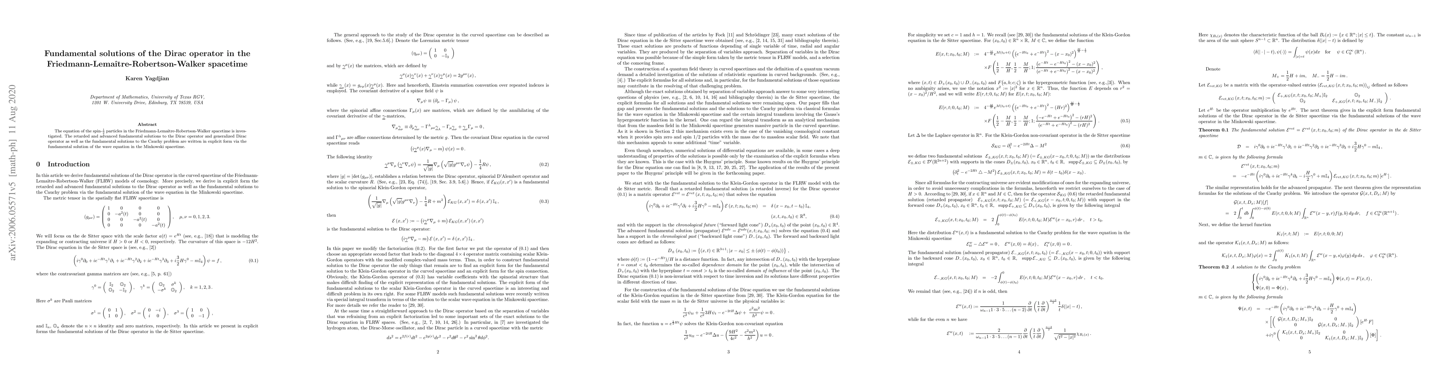 The equation of the spin-$\frac{1}{2}$ particles in the Friedmann-Lema\^itre-Robertson-Walker spacetime is investigated. The retarded and advanced fundamental solutions to the Dirac operator and generalized Dirac operator as well as the fundamental solutions to the Cauchy problem are written in explicit form via the fundamental solution of the wave equation in the Minkowski spacetime.