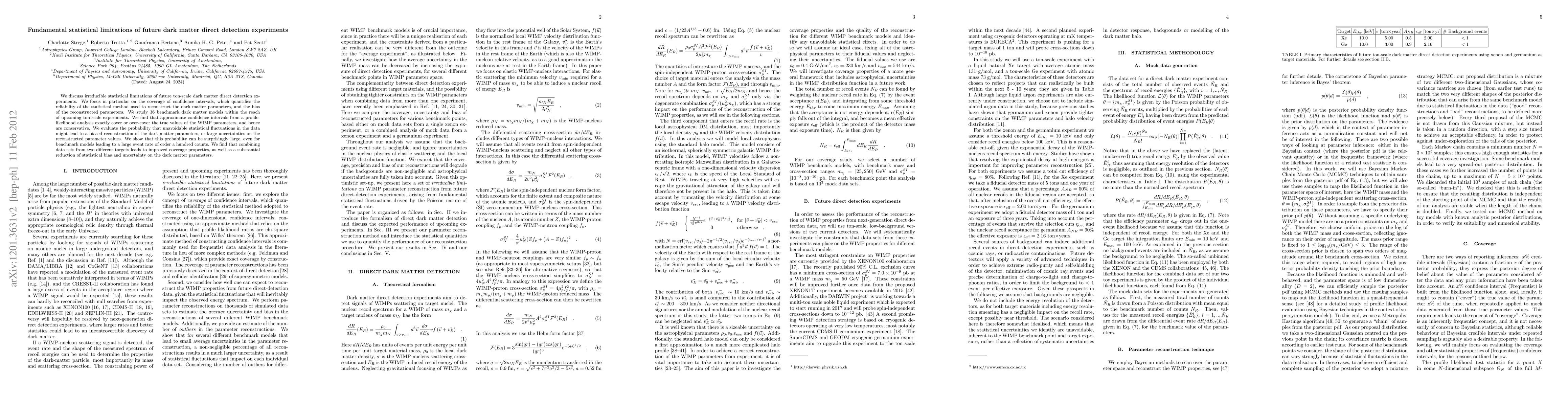 This paper examines the statistical limitations of future ton-scale dark matter detection experiments, finding that while approximate confidence intervals are conservative, there is a significant probability of biased parameter reconstruction due to statistical fluctuations. Combining data from different targets improves coverage and reduces bias and uncertainty.