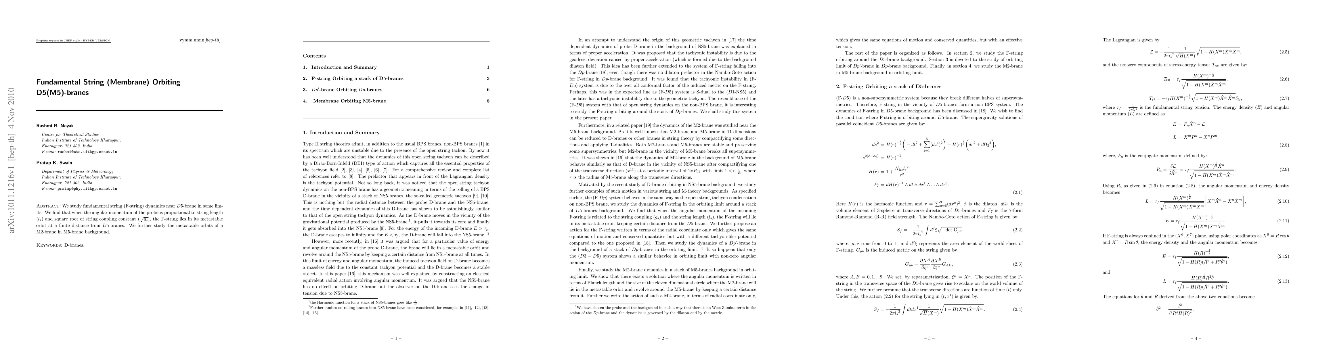 This research investigates the dynamics of fundamental strings orbiting D5-branes, discovering that under specific angular momentum conditions, strings maintain metastable orbits at finite distances. Additionally, it explores the metastable orbits of M2-branes in an M5-brane background.