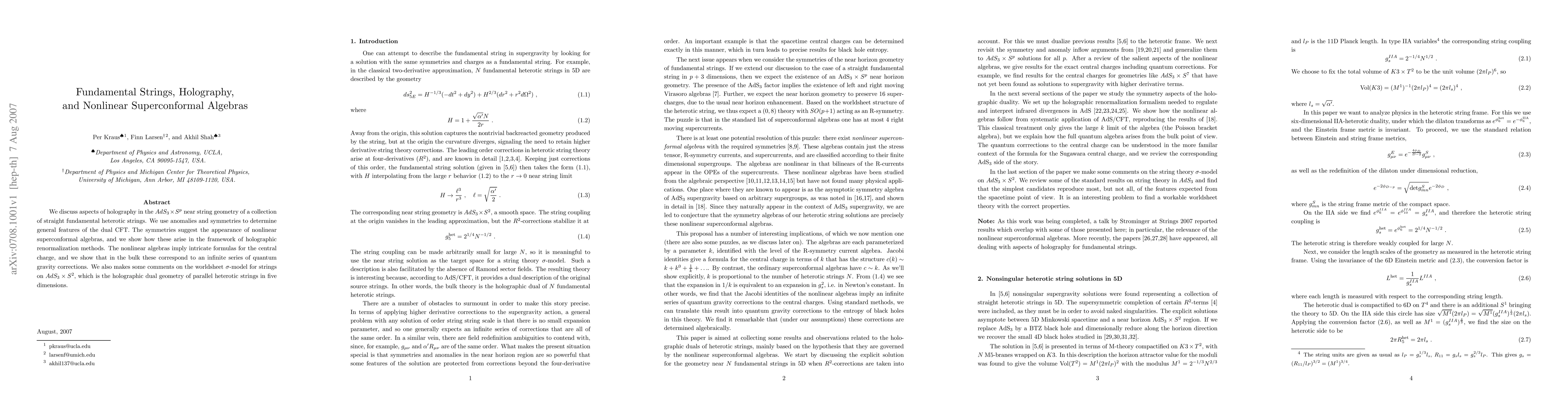This paper explores holography in the context of AdS_3 × S^p near fundamental heterotic strings, revealing nonlinear superconformal algebras through symmetries and anomalies. It demonstrates how these algebras emerge in holographic renormalization, leading to complex central charge formulas and quantum gravity corrections.