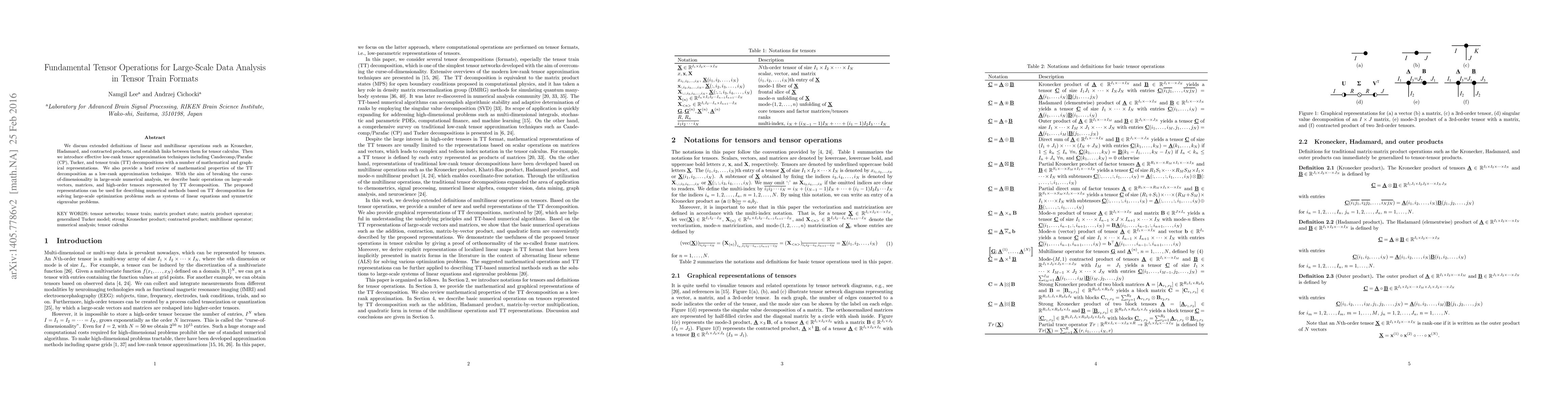 This paper extends definitions of tensor operations like Kronecker, Hadamard, and contracted products, and introduces low-rank tensor approximations such as CP, Tucker, and TT decompositions. It aims to overcome the curse-of-dimensionality in large-scale data analysis by describing basic operations on tensors using TT decomposition for solving large-scale optimization problems.