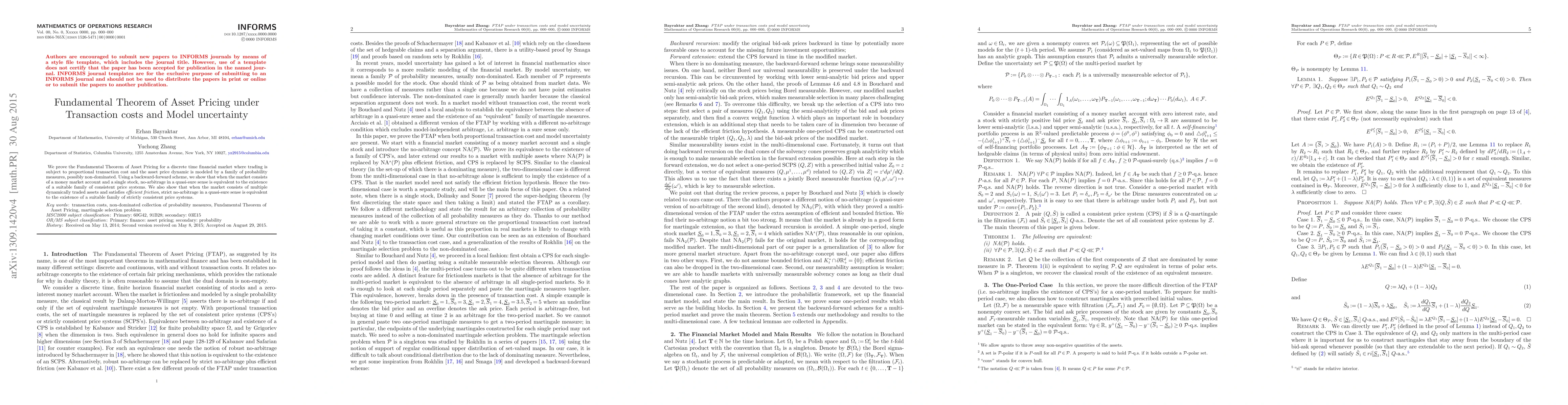 This paper proves the Fundamental Theorem of Asset Pricing in a discrete time market with transaction costs and model uncertainty. It demonstrates that no-arbitrage conditions are equivalent to the existence of consistent price systems, even when asset price dynamics are modeled by non-dominated probability measures.