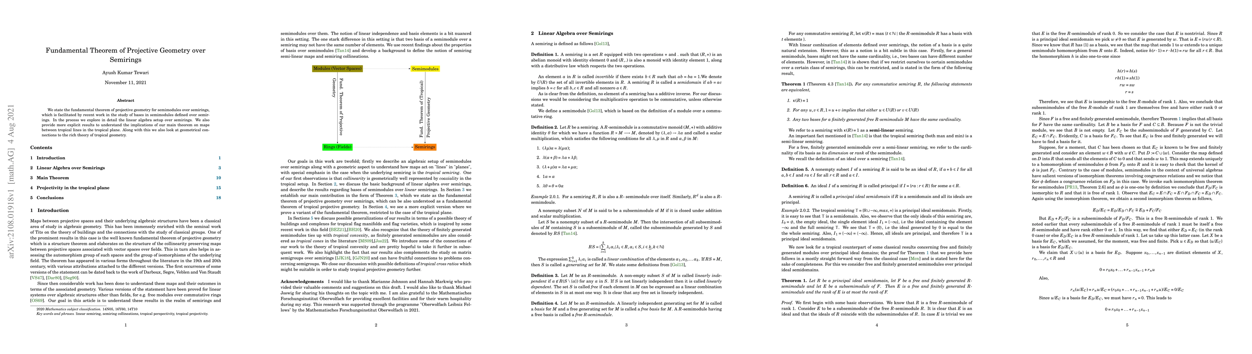 This paper establishes the fundamental theorem of projective geometry for semimodules over semirings, drawing on advancements in semimodule bases. It elucidates linear algebra over semirings and examines implications on maps between tropical lines, linking to tropical geometry.