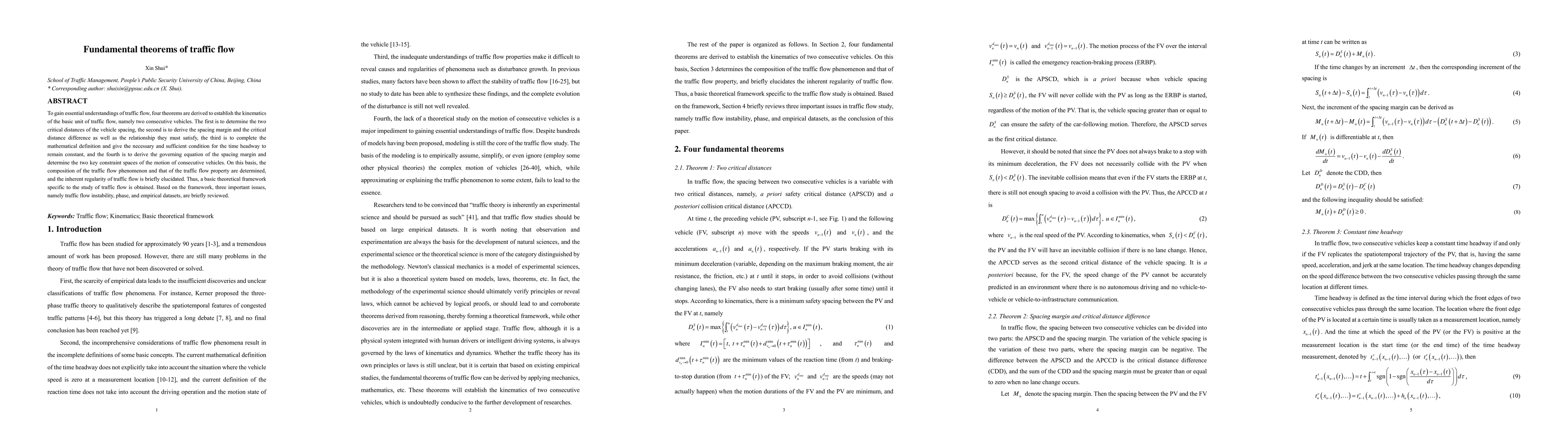 This paper presents four fundamental theorems to understand traffic flow dynamics by analyzing the kinematics of two consecutive vehicles. It establishes critical distances, spacing margins, and the conditions for constant time headway, ultimately providing a theoretical framework for studying traffic flow and reviewing related issues like instability and phase transitions.