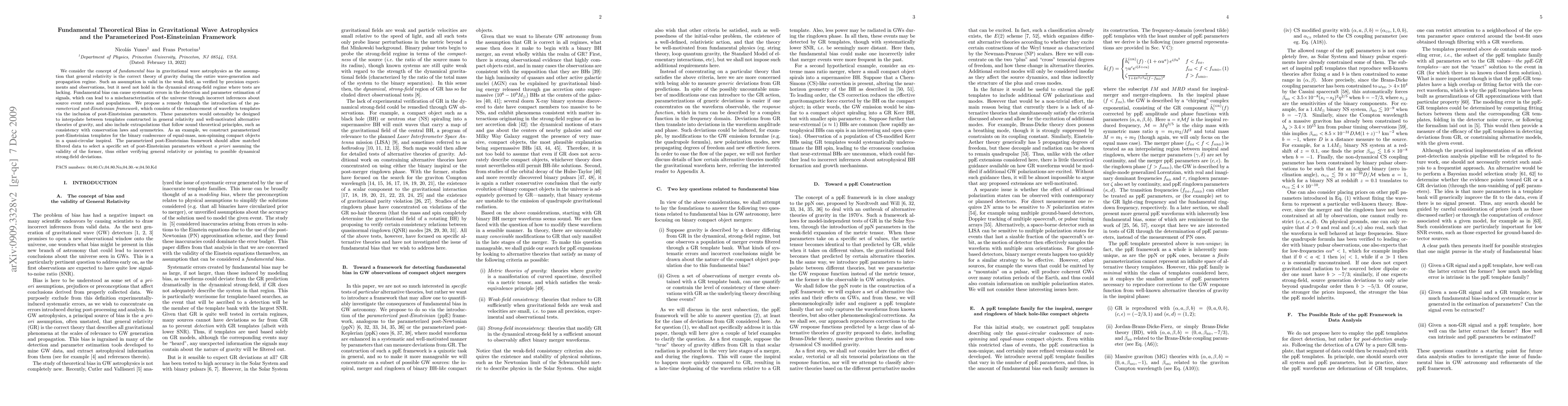 This paper discusses the fundamental bias in gravitational wave astrophysics due to the assumption that general relativity is universally correct, proposing the parameterized post-Einsteinian framework to mitigate systematic errors in signal detection and parameter estimation by incorporating post-Einsteinian parameters that can account for alternative theories of gravity.