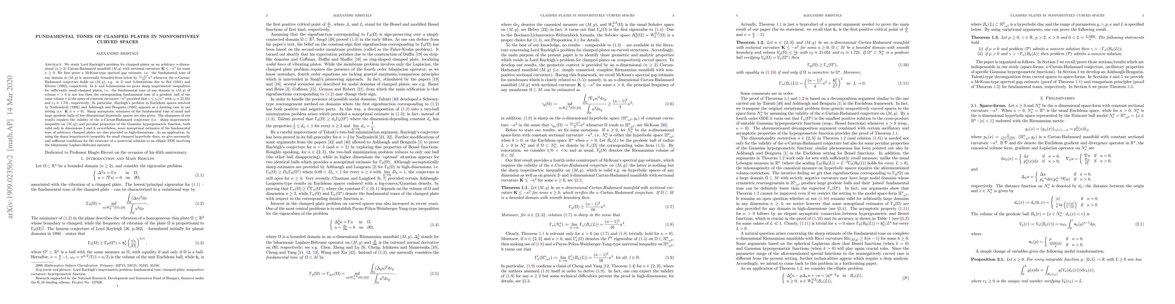 Researchers study clamped plates on nonpositively curved spaces with limited curvature, finding universal bounds for fundamental tones and sharp isoperimetric inequalities in 2- and 3-dimensions.