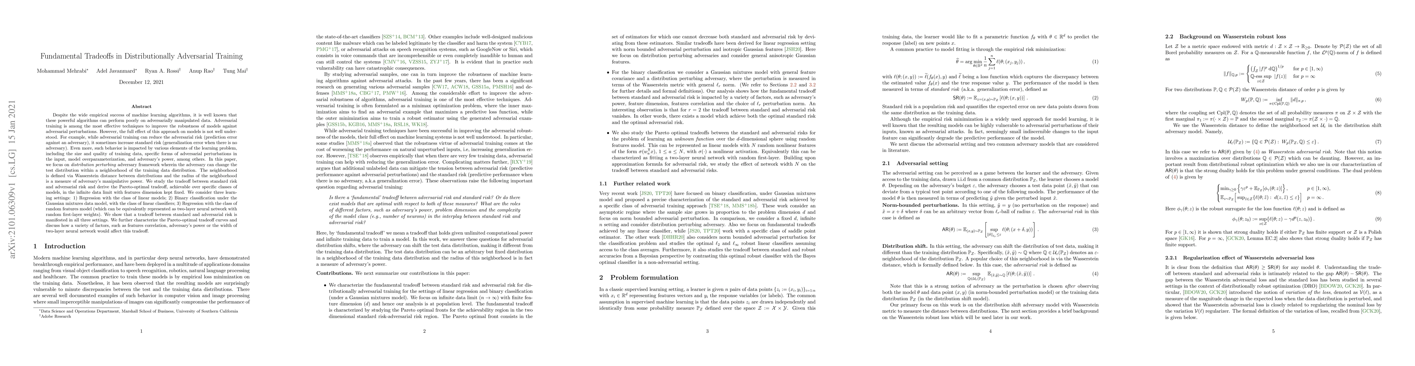 This paper investigates the fundamental tradeoffs in distributionally adversarial training, focusing on how adversarial training affects both standard and adversarial risks. It derives the Pareto-optimal tradeoff between these risks in various learning settings, highlighting the influence of factors like data quality, perturbation forms, and model characteristics.