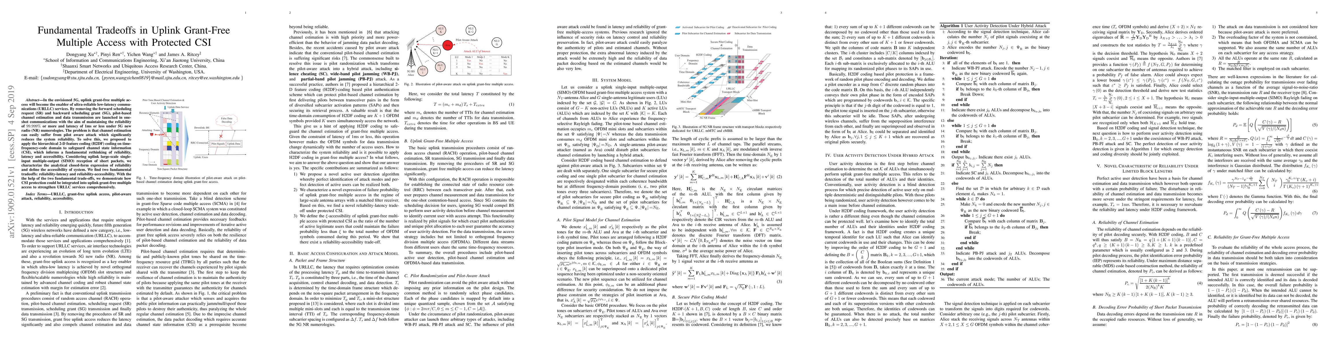 This paper explores the fundamental tradeoffs in grant-free multiple access for 5G uplink, focusing on maintaining ultra-reliable low-latency communications (URLLC) while protecting channel state information (CSI) from pilot aware attacks. It proposes hierarchical 2-D feature coding (H2DF) to safeguard CSI and identifies two key tradeoffs: reliability-latency and reliability-accessibility.